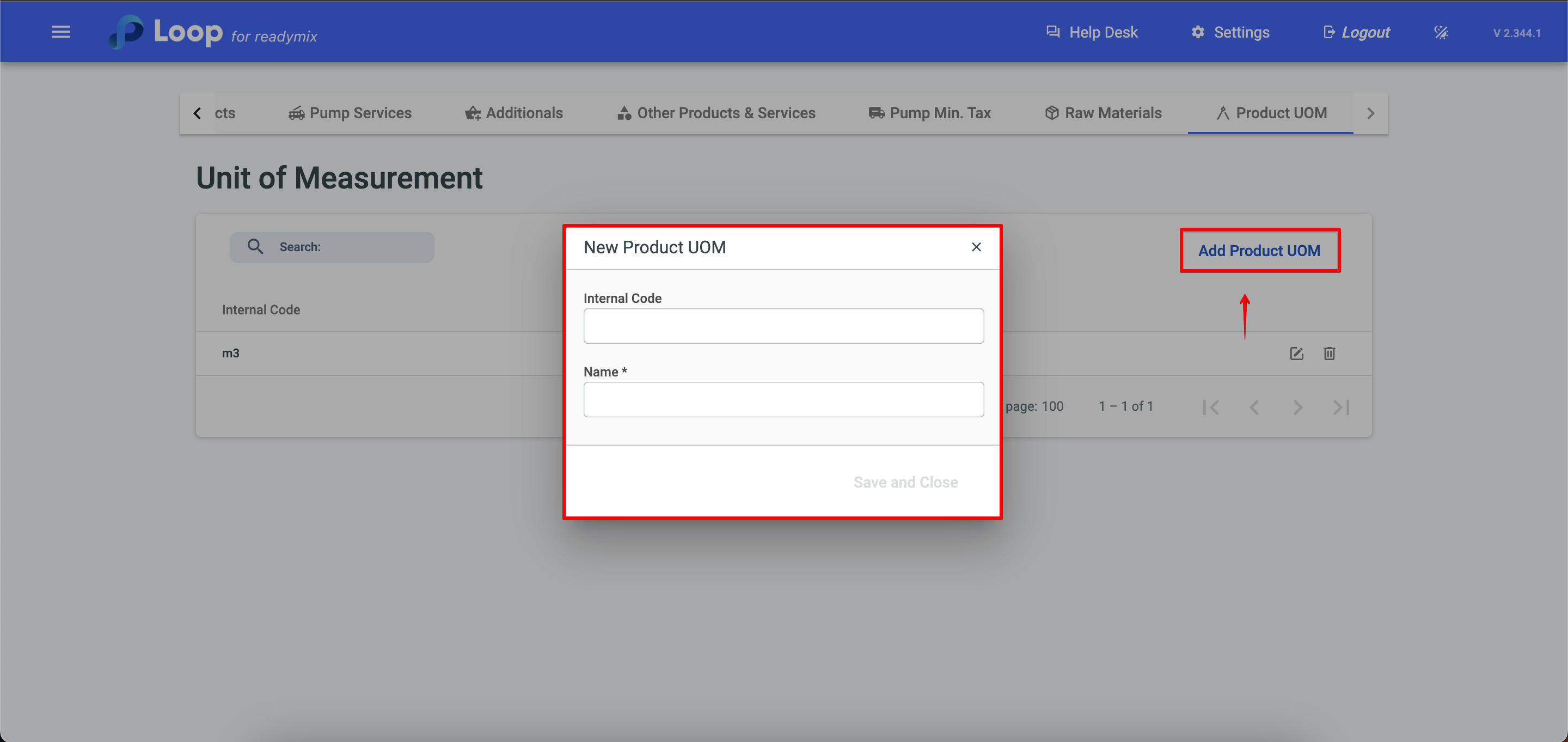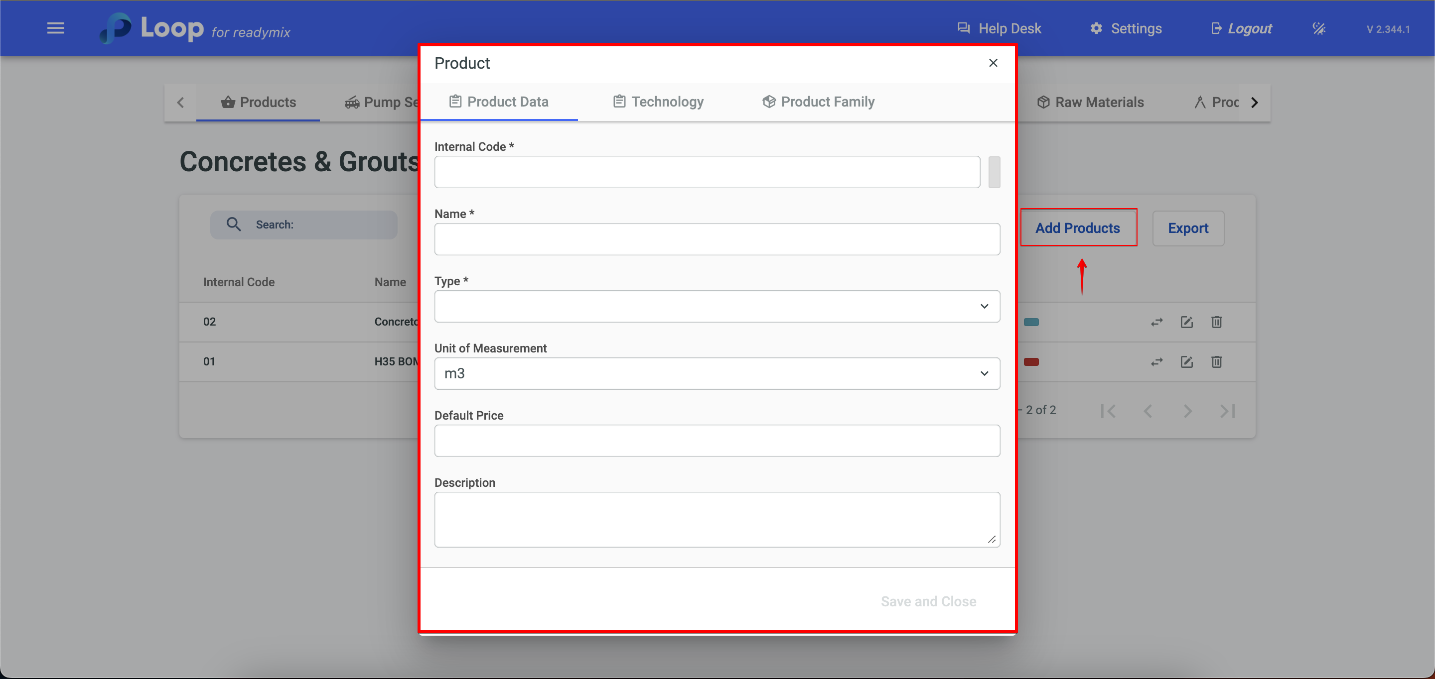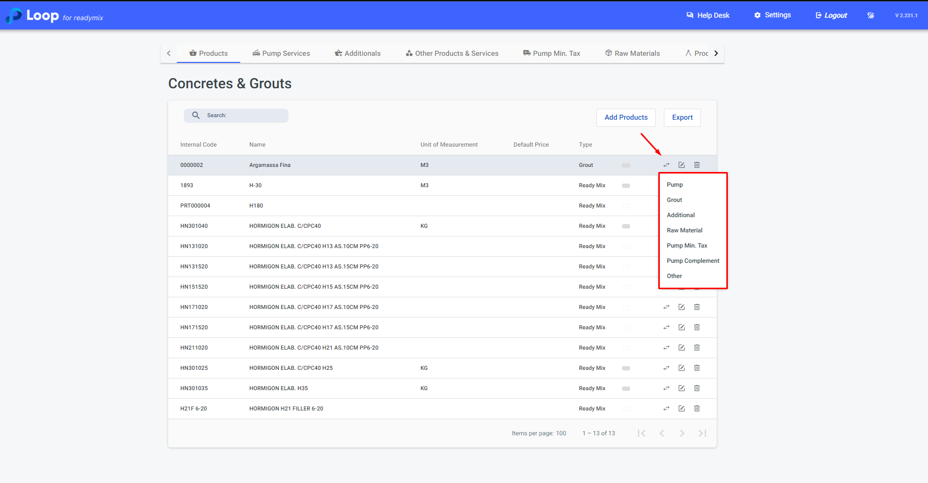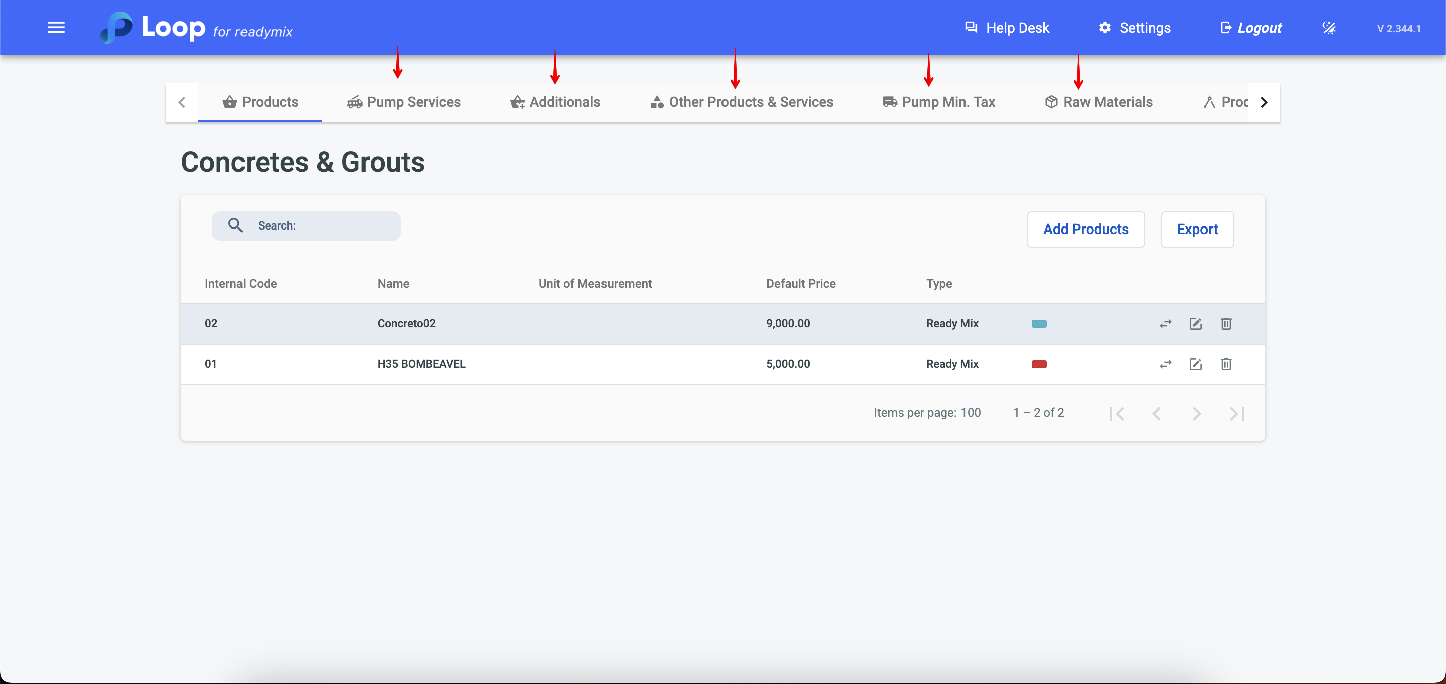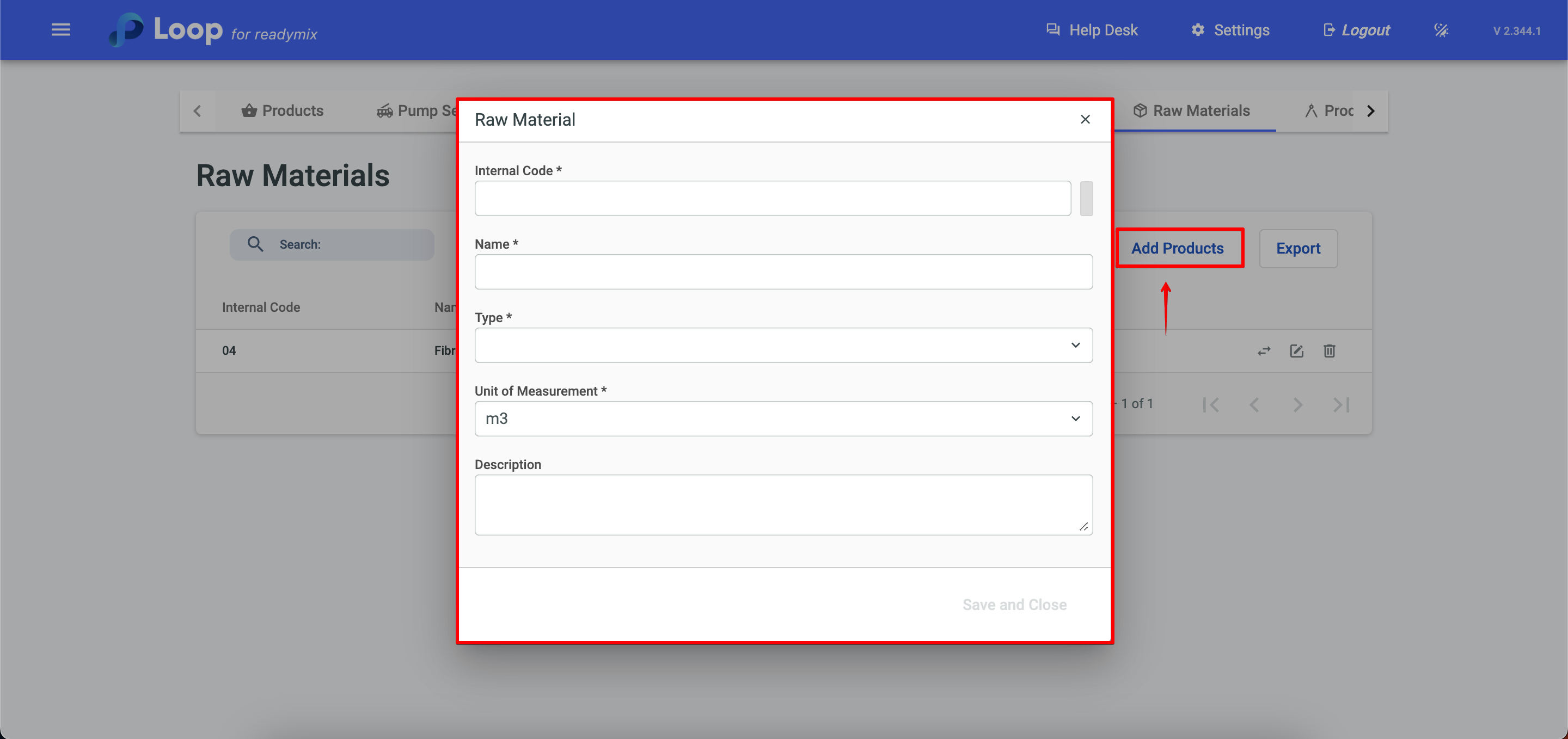 In the "Raw Materials" tab, it is possible to add all the raw materials used in the formulas of your Readymix, mortars, etc.