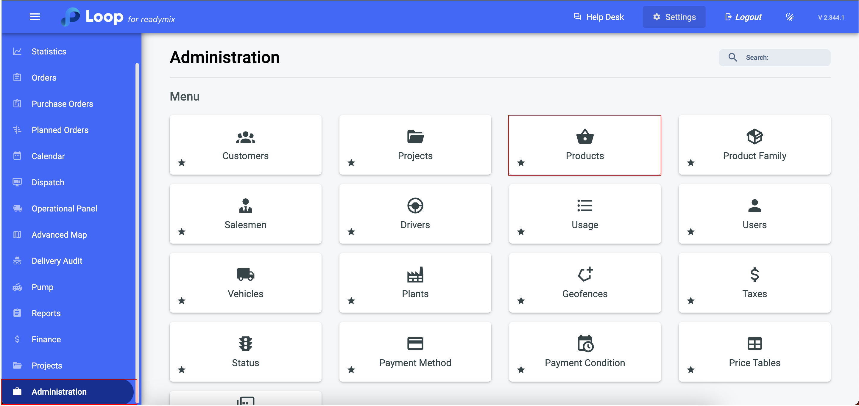 Open the menu on the left side of the screen and select "Administration" > "Products".