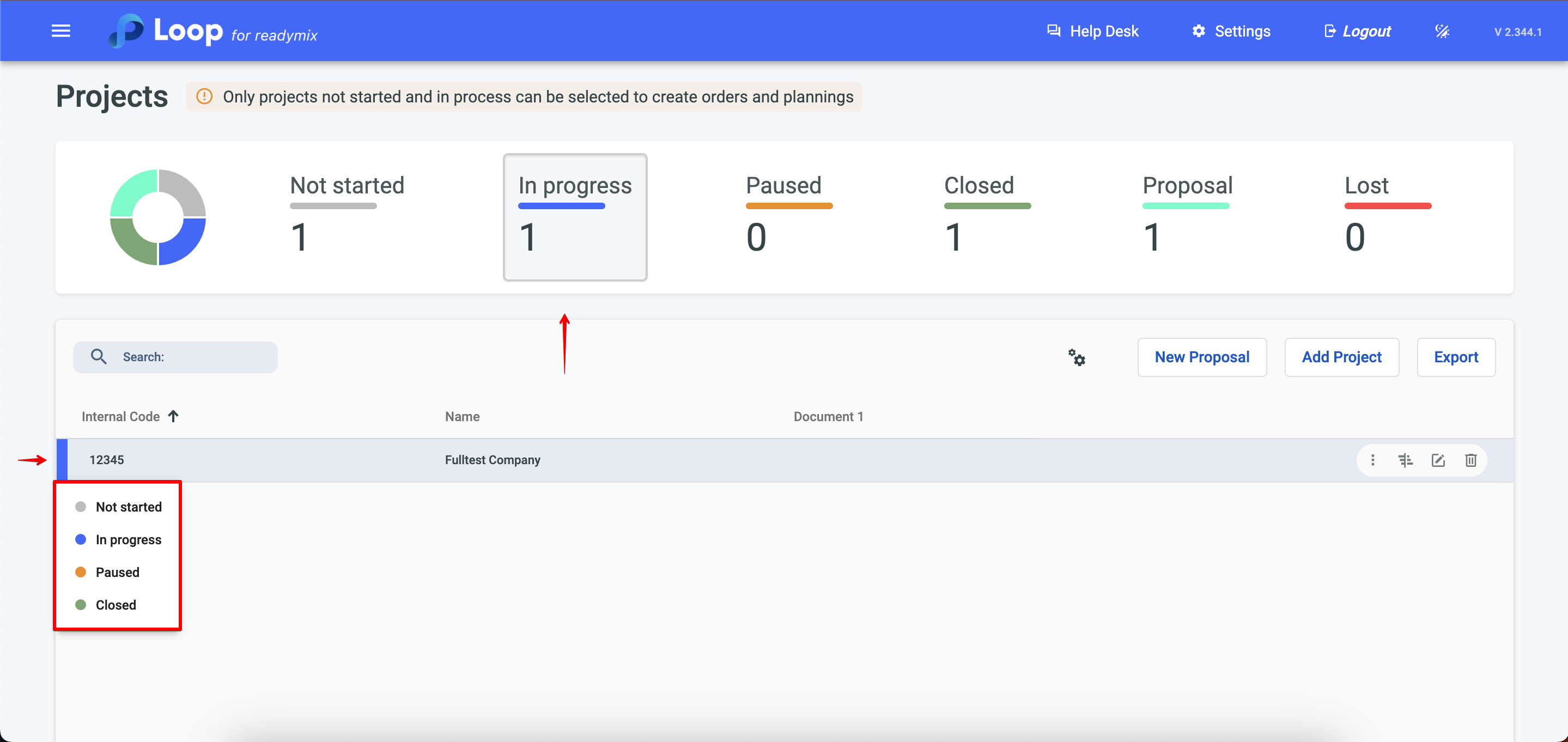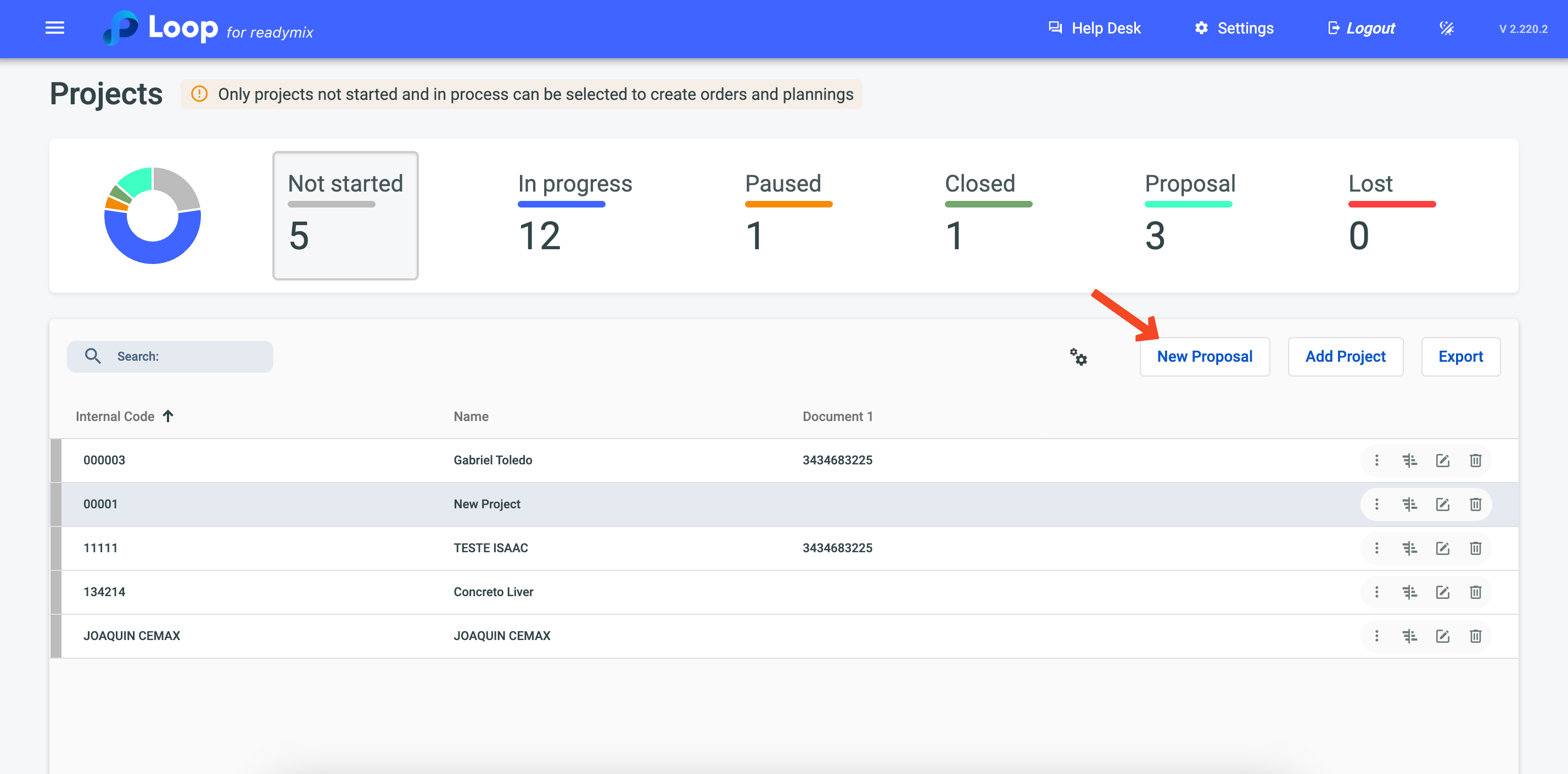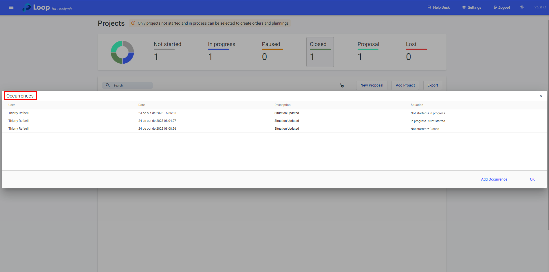 Through an intuitive interface, it is possible to access the icon with its corresponding color, being able to click on the options: Not started, In progress, Suspended, Closed, Proposed and Lost to make a more agile filter and also change the situation of the project in the left corner of the screen.
