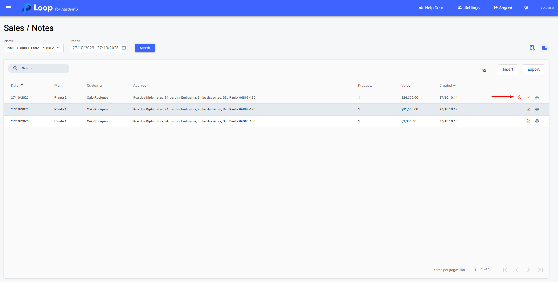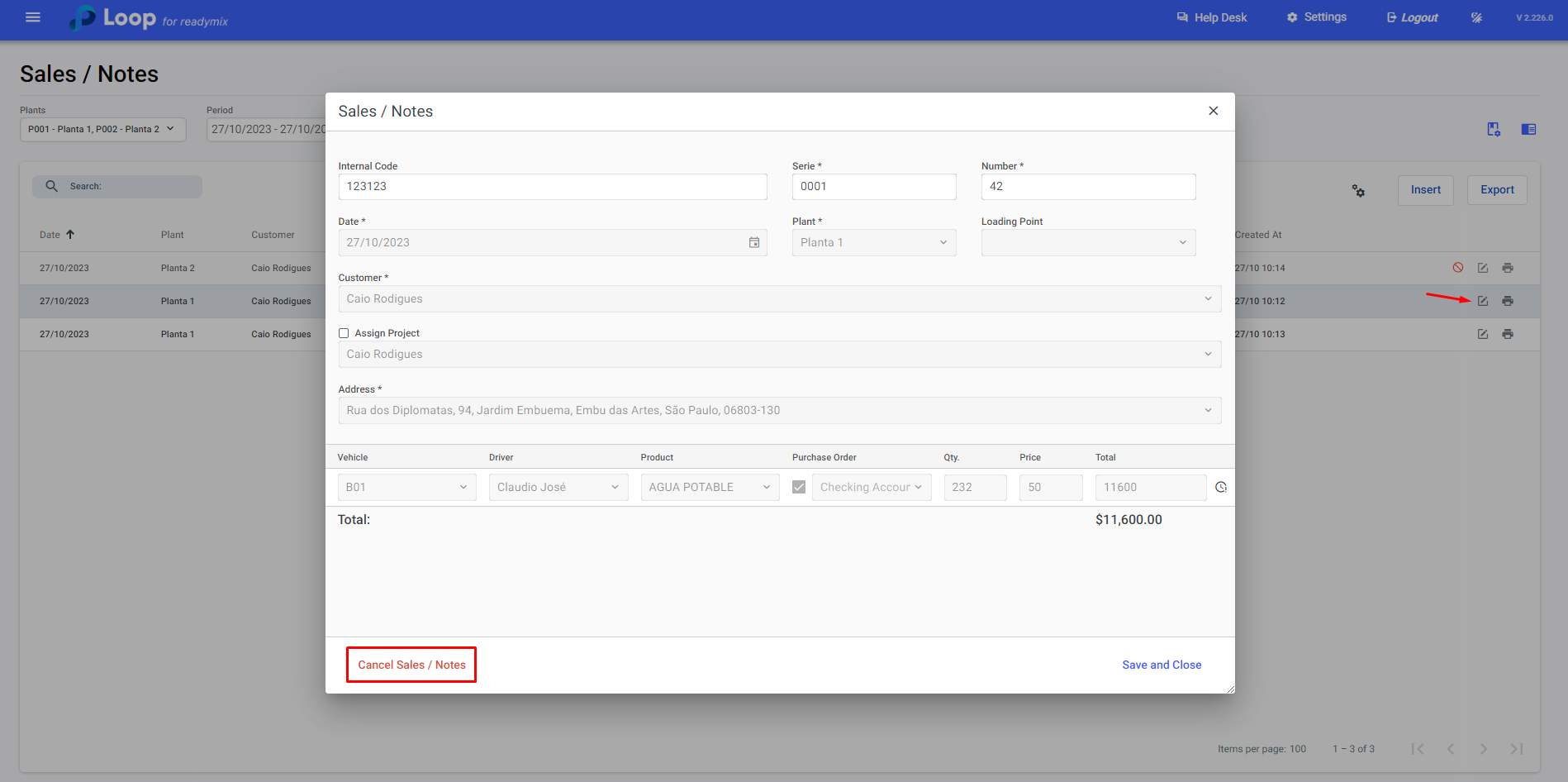 To cancel a sale/note, just click on the indicated icon and then on "Cancel Sales/Notes."