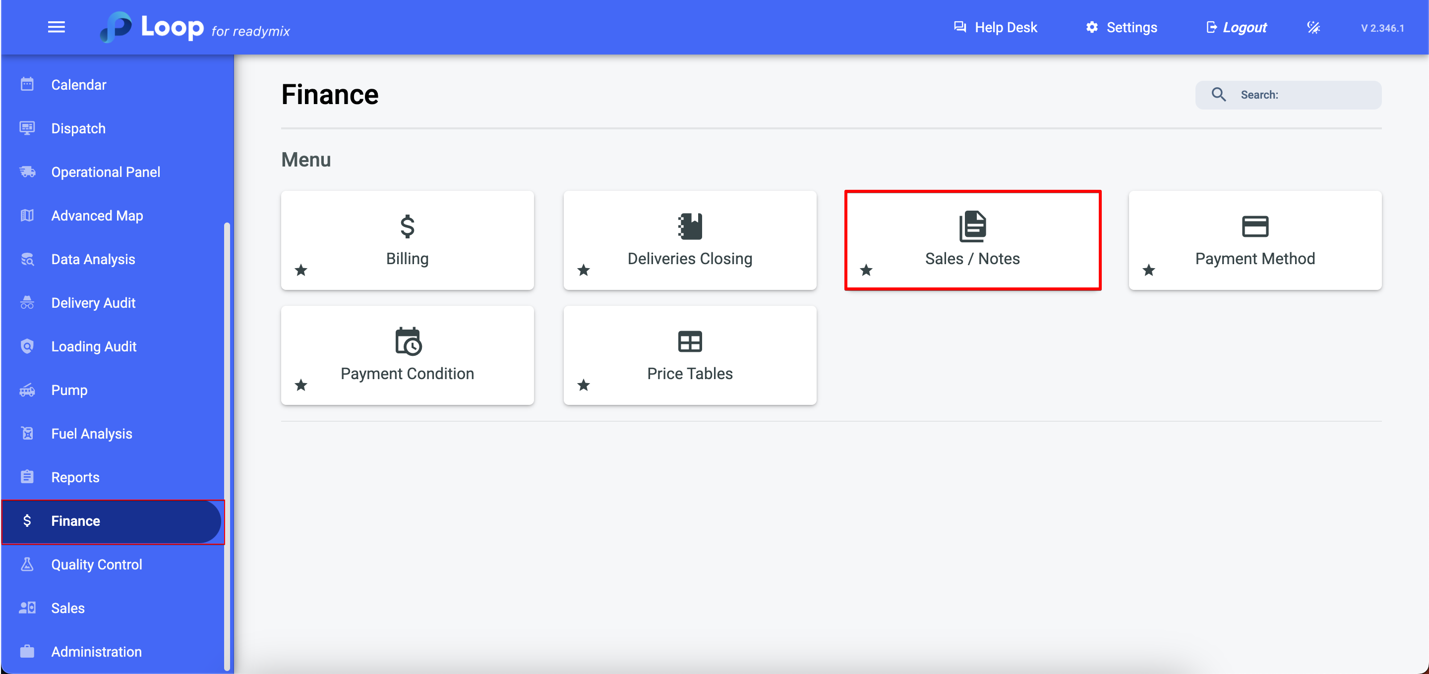 Open the menu on the left side of the screen and select "Finance" - "Sales/Notes"