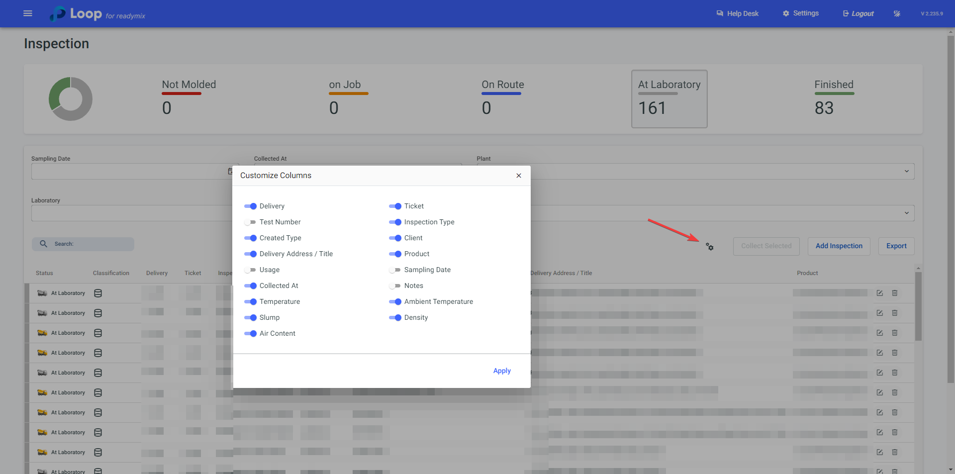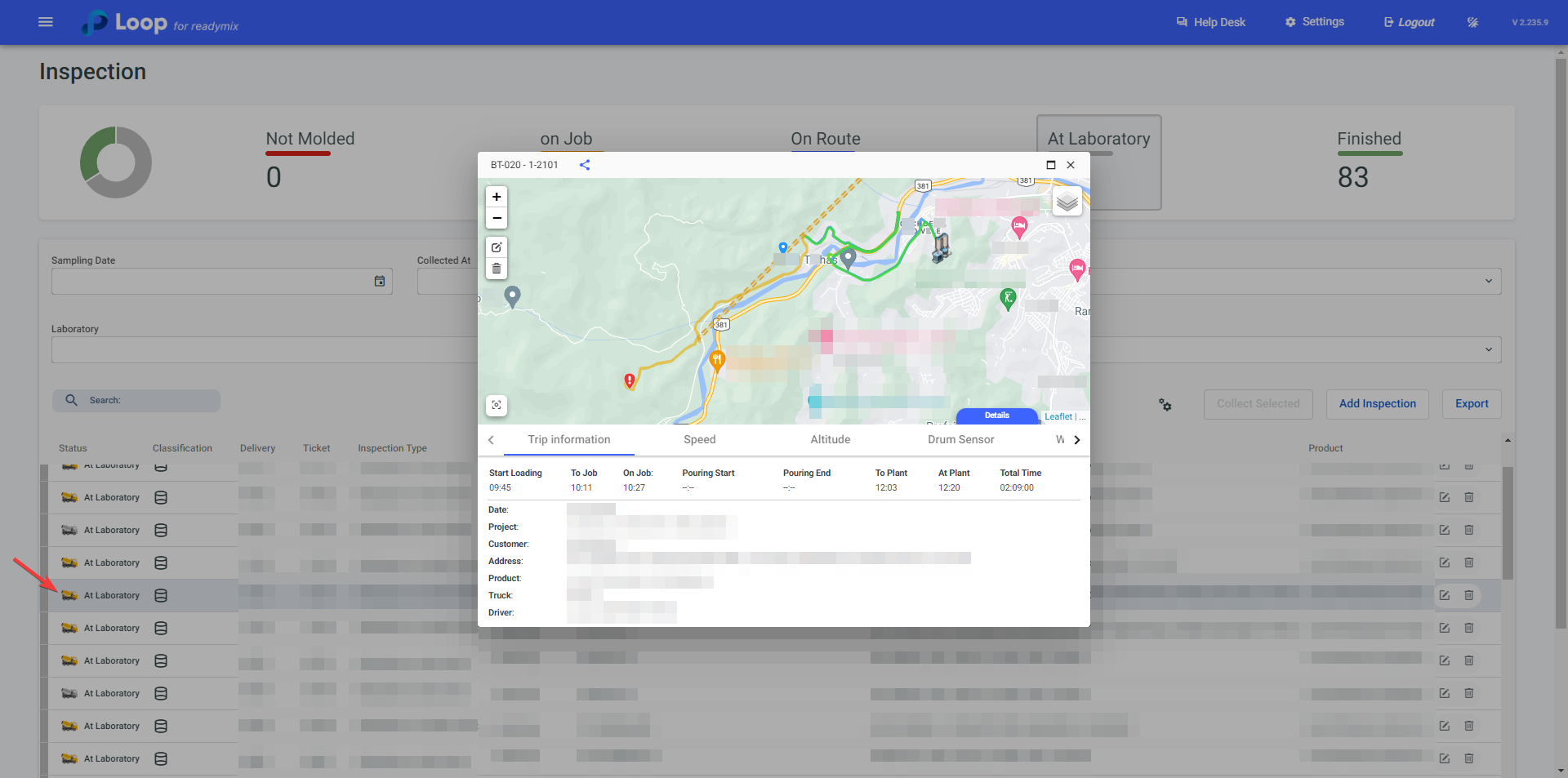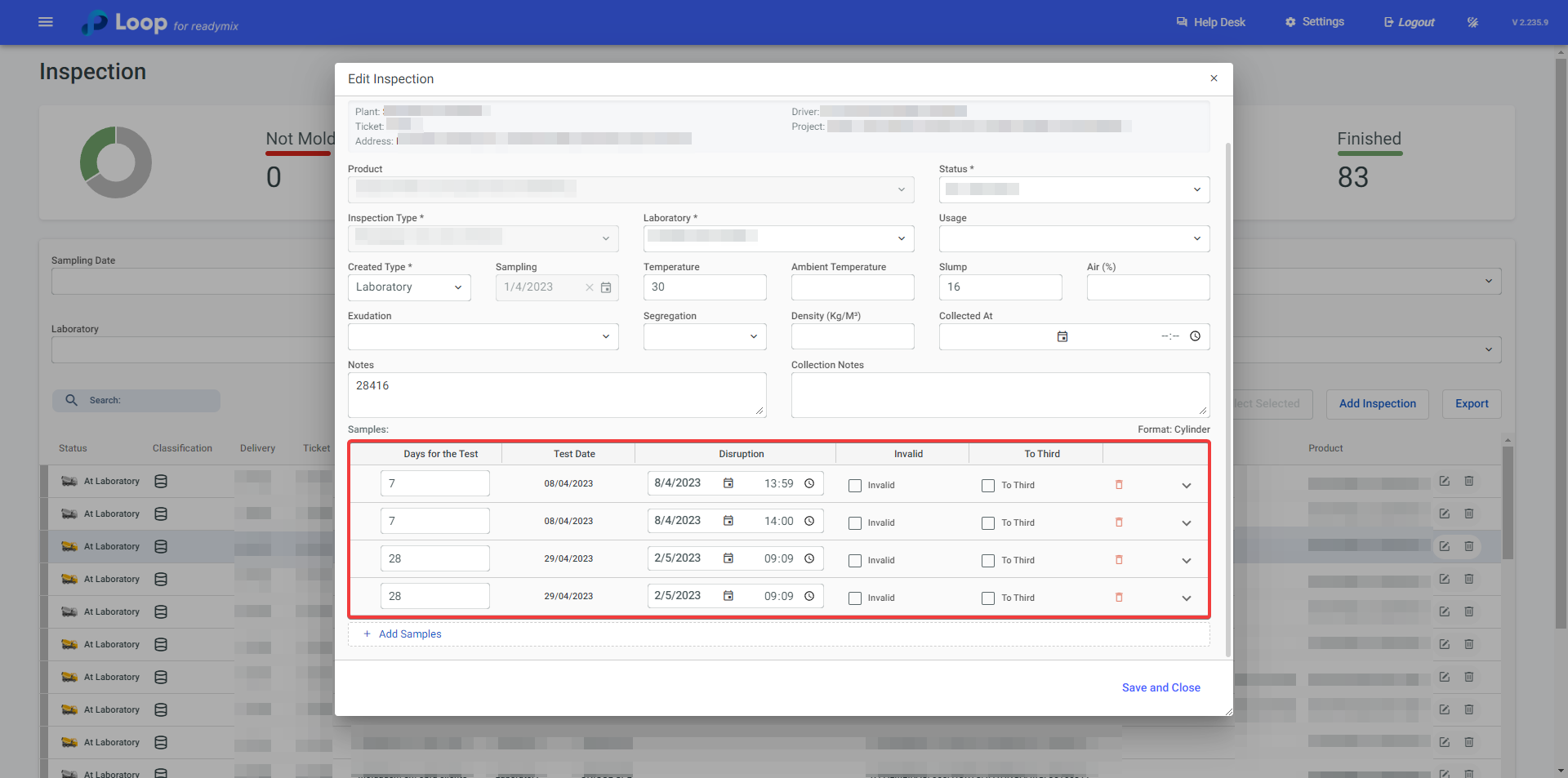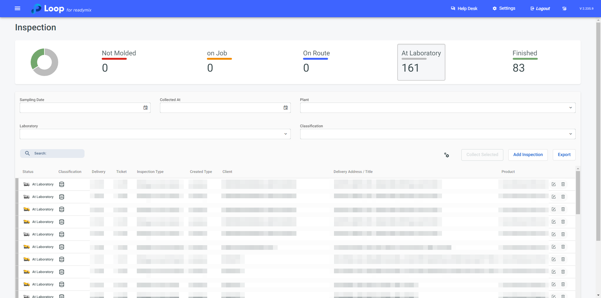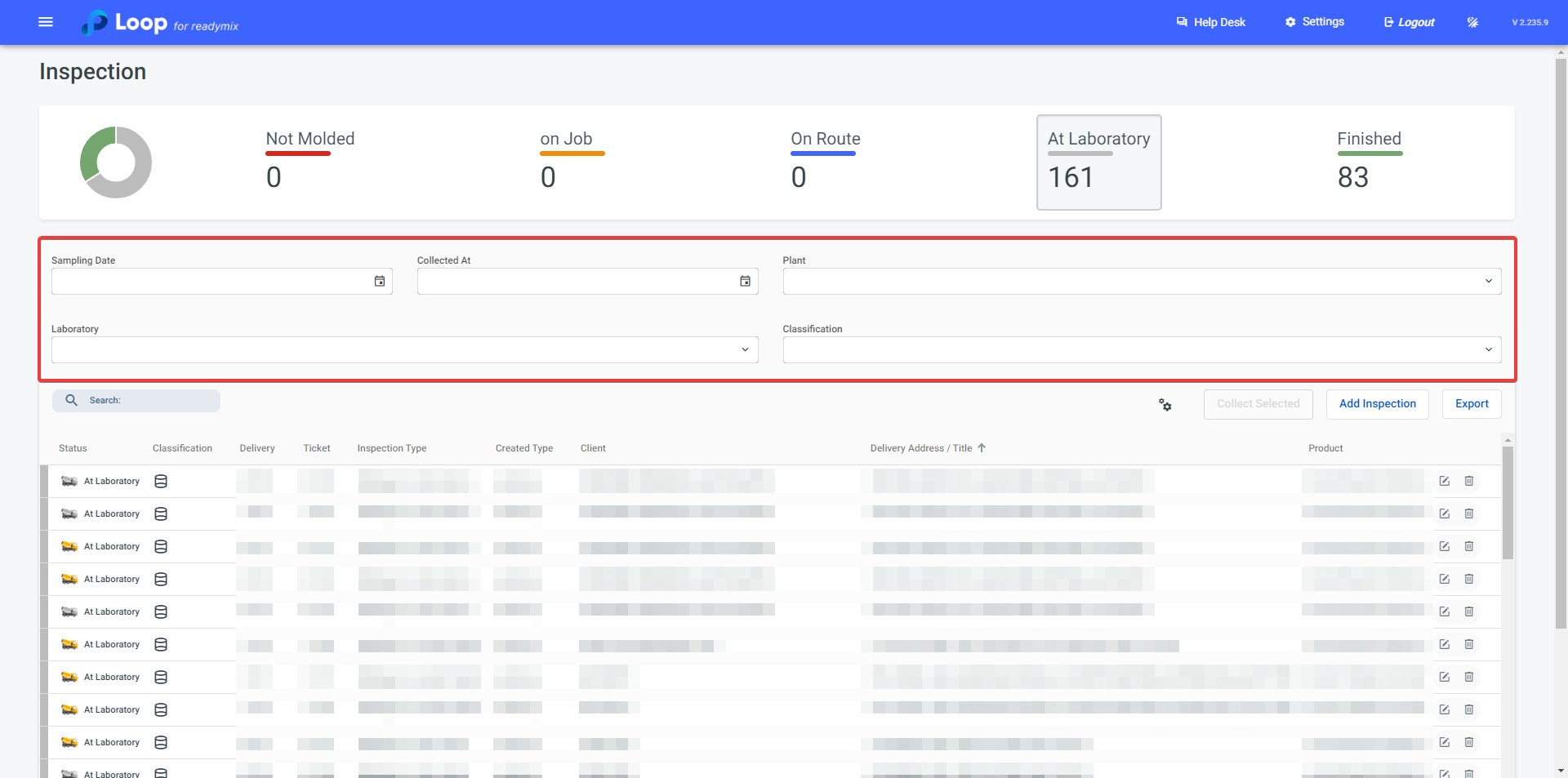 Status: Refers to the current status of the inspection, indicating whether it is Unmolded, On-site, On route, In the laboratory, or Finished.