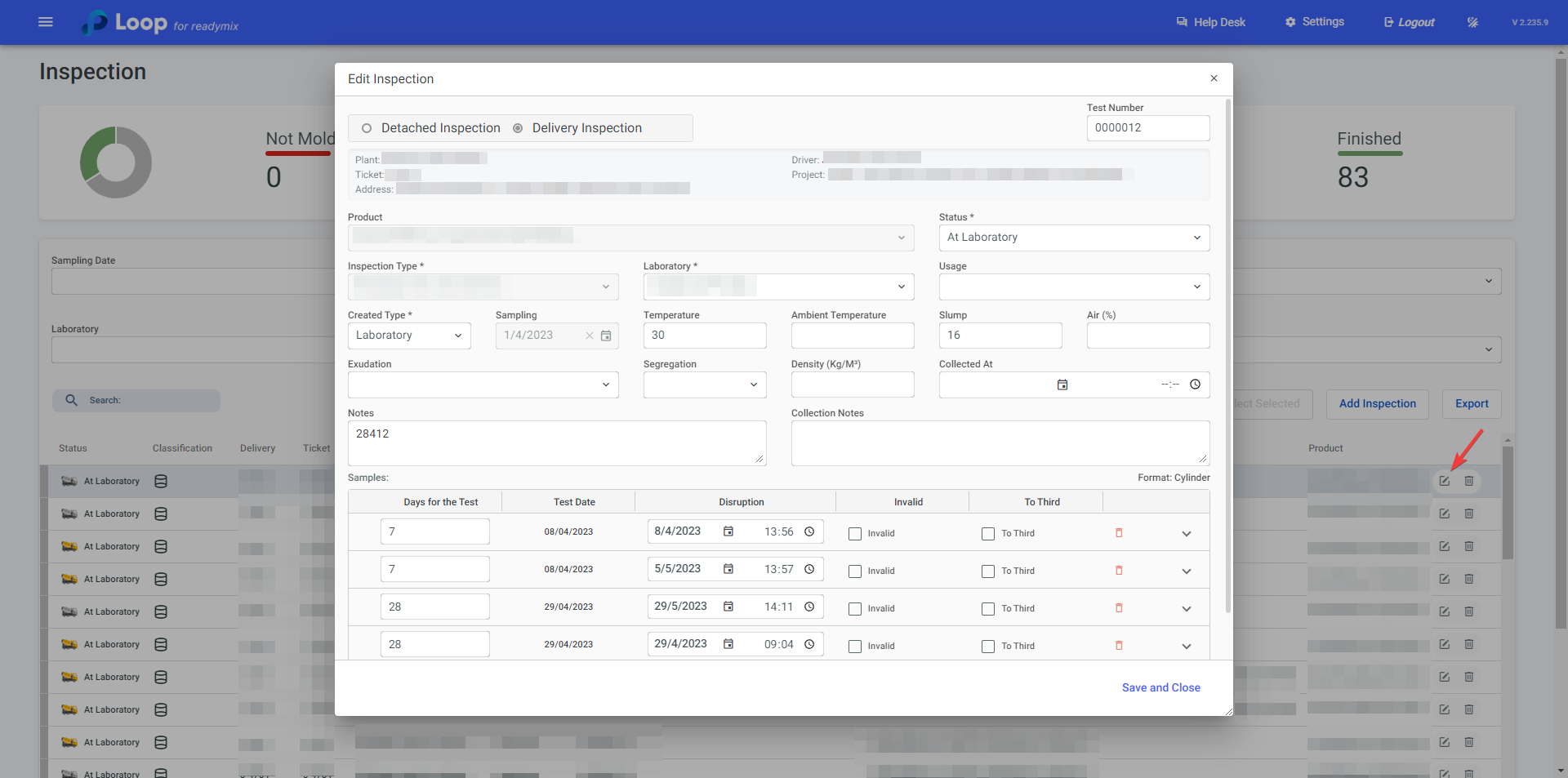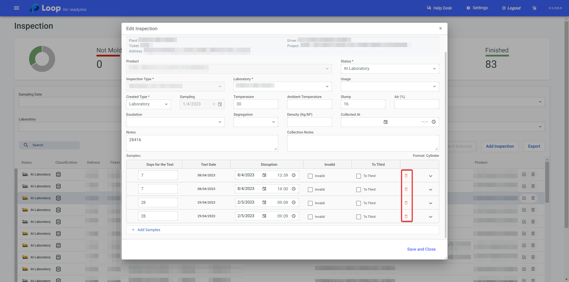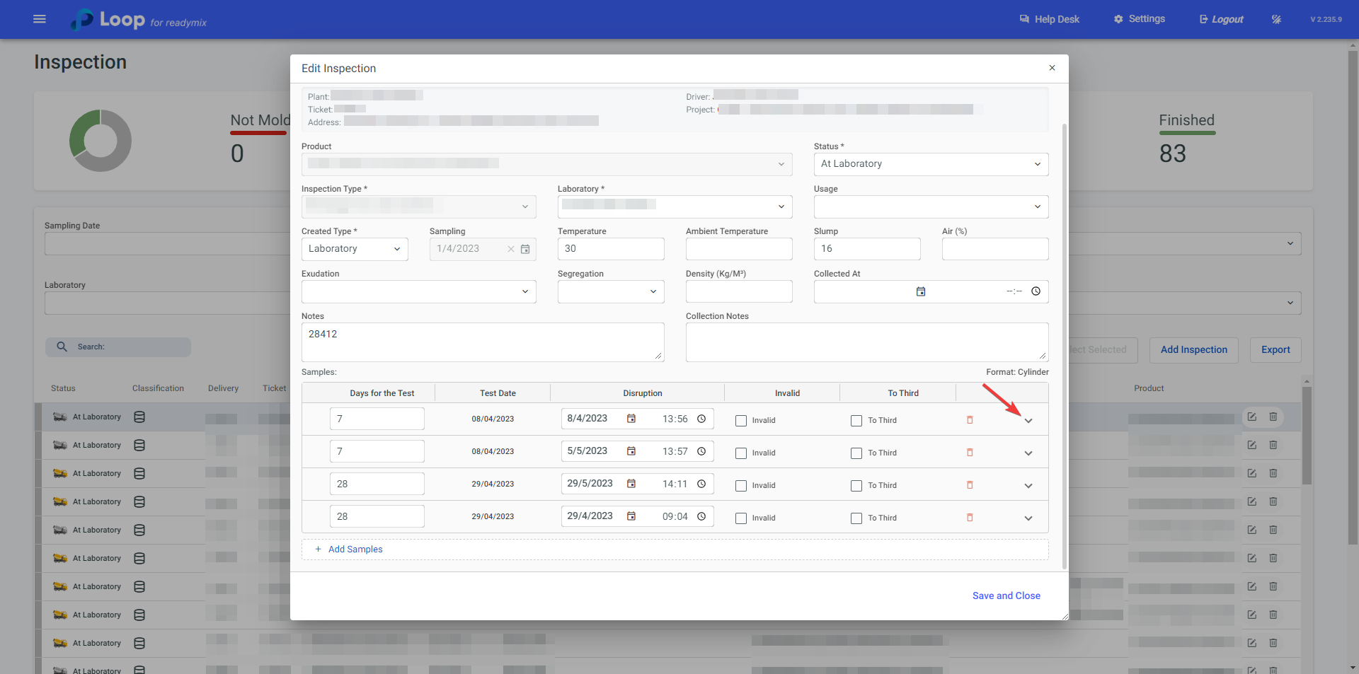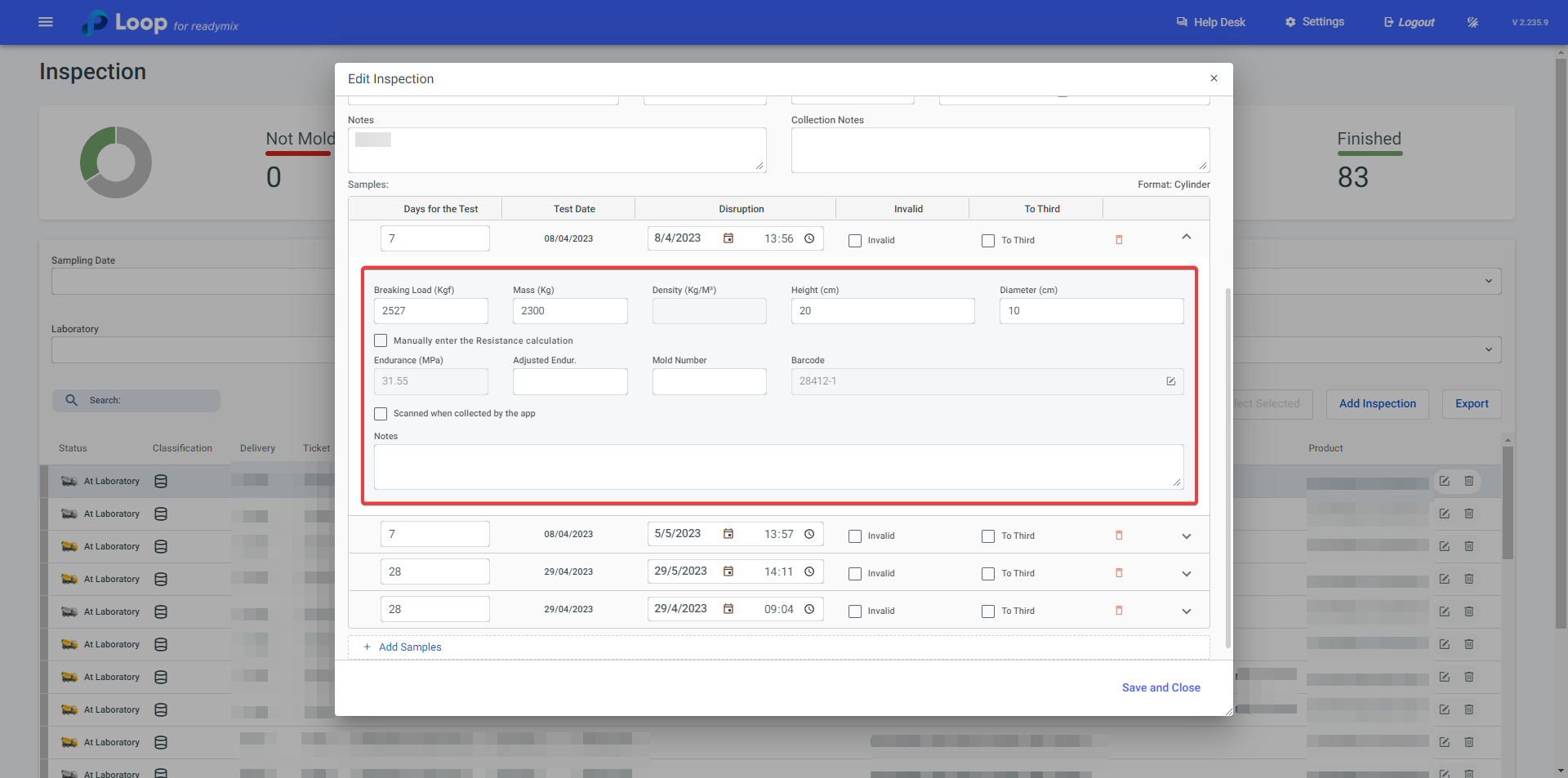Furthermore, by clicking on the "V" icon on a sample, you can check the characteristics of its test, such as Breakage Load (KN), Mass (Kg), Density (Kg/M³), Strength (Kgf/cm²), among others. You can also add notes relevant to the test.