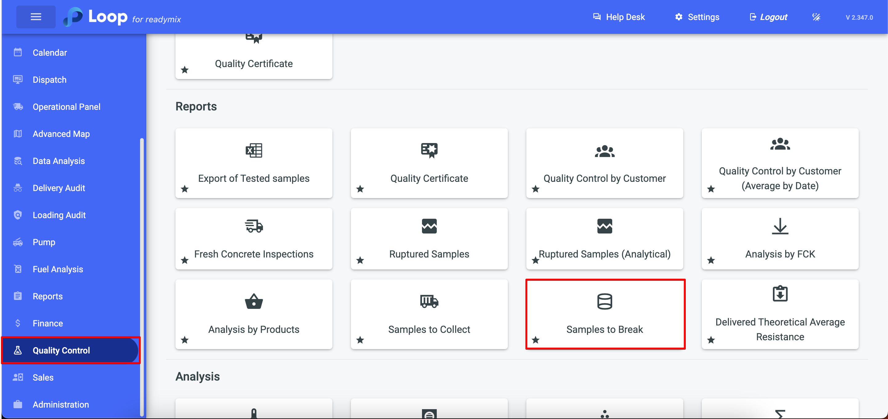 Open the menu on the left side of the screen and select 'Quality Control' - 'Reports' - 'Sample to Break'.