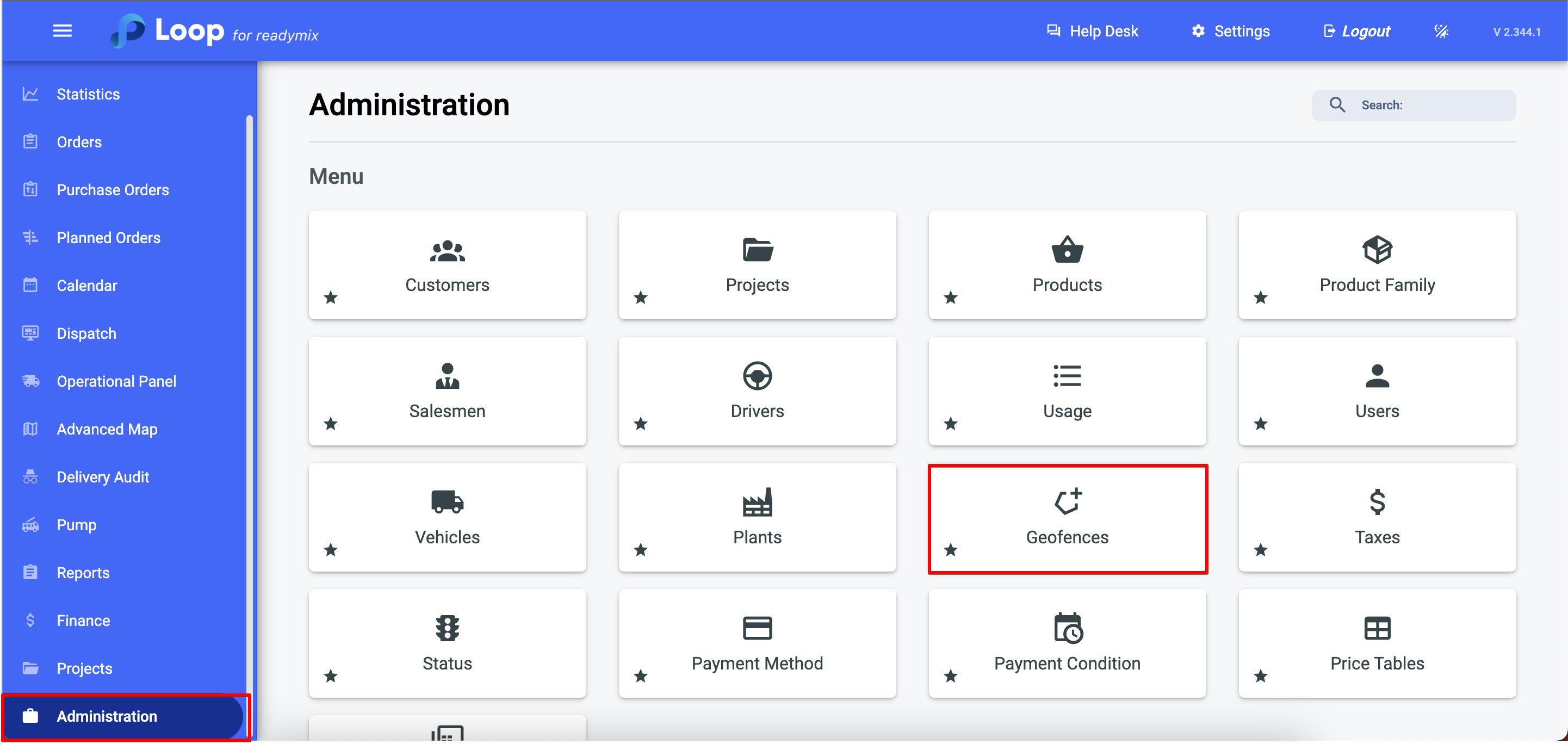 Open the menu on the left side of the screen and select "Administration" - "Geofences"