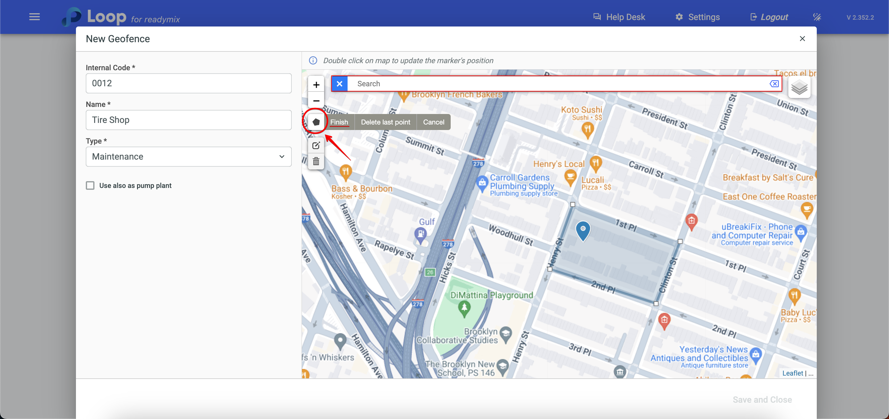 After filling in the required fields, enter the address in the search bar under "Search" and click on the polygon to visually draw the geofence. Once you've defined the boundaries, click on "Finish." You can also double-click to precisely mark the stop location with a pin.