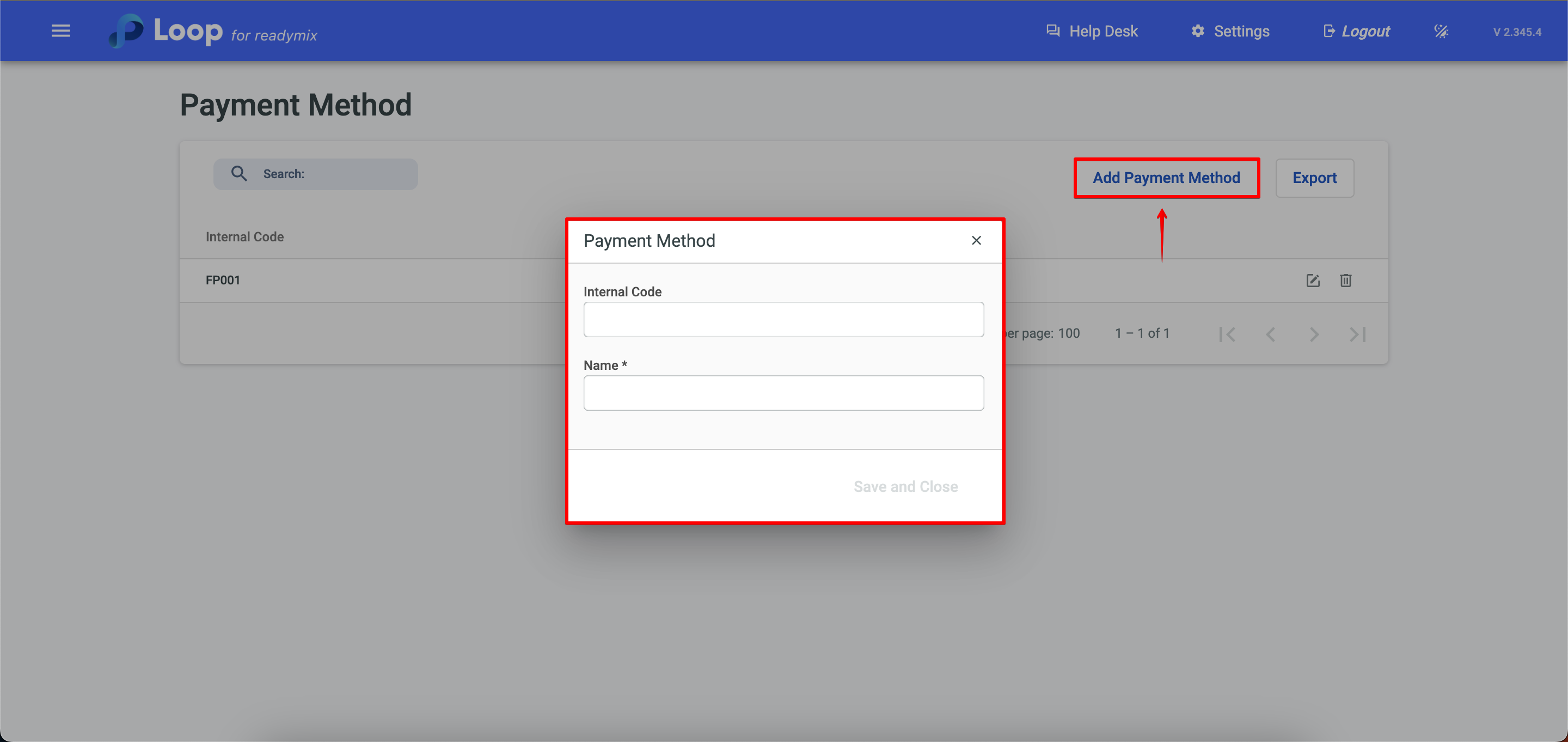 Click on "Add Payment Method" and fill in the fields "Internal Code" and "Name", and finally click Save and Close.