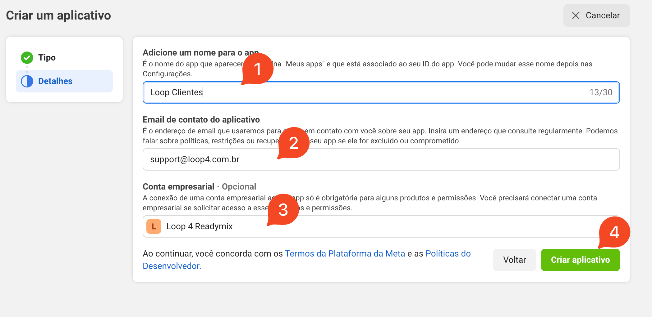Choose a name for your application (Suggestion: LOOP Clientes).