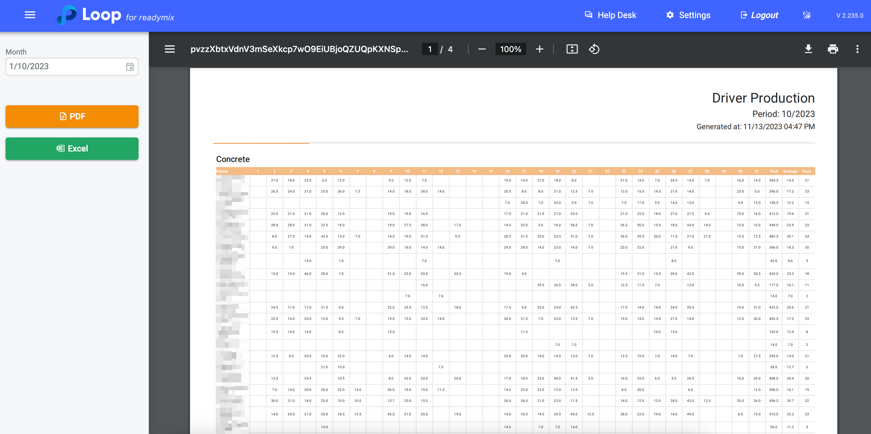 This report condenses the daily volume of Readymix delivered by drivers throughout the month, providing a concise overview of their activities. It includes the total monthly Readymix delivered, a daily average, and the number of days deliveries were made, contributing to a comprehensive analysis of individual performance.