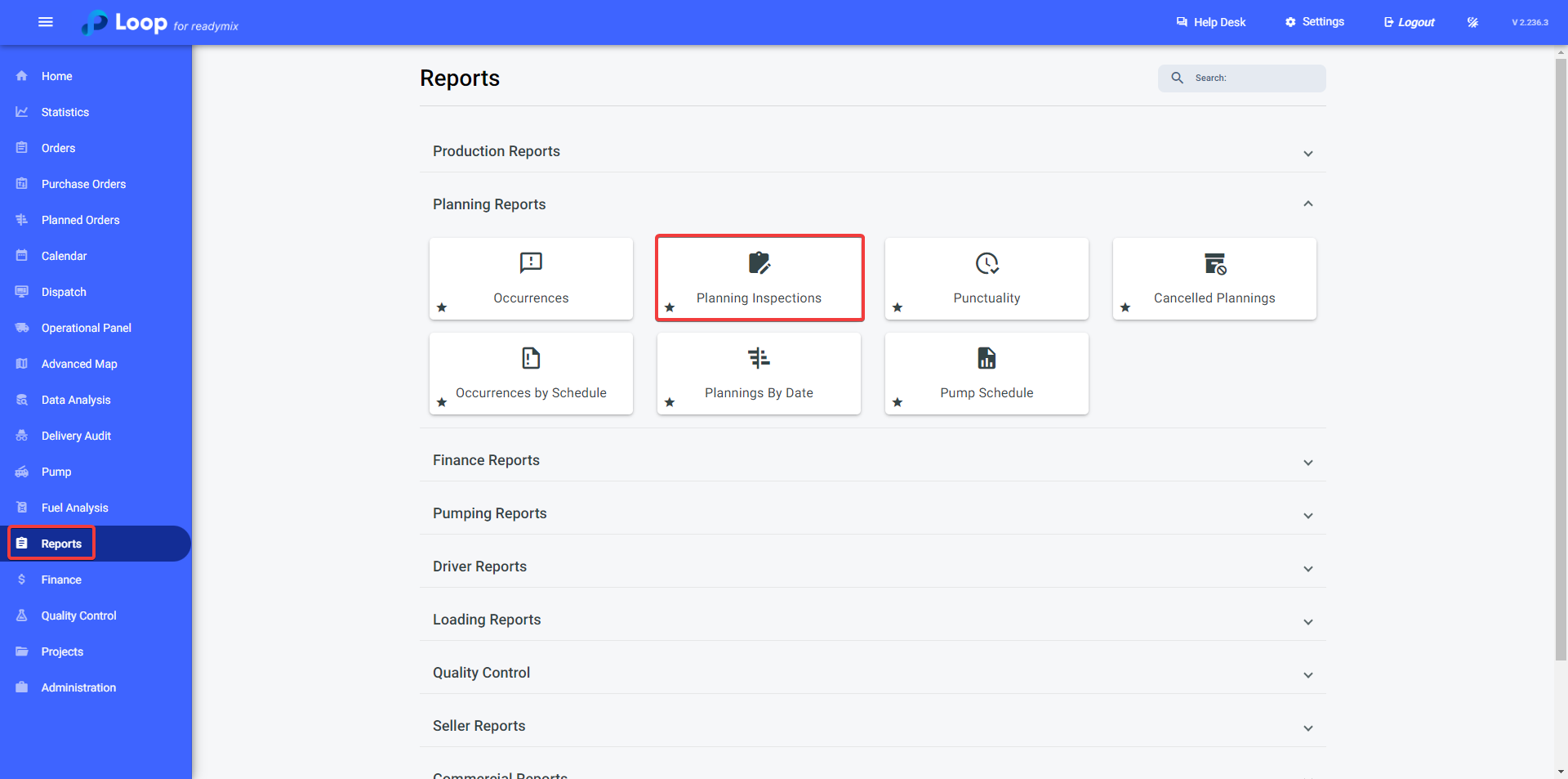 Open the menu on the left side of the screen and select "Reports" - "Planning Reports" - "Planning Inspections".