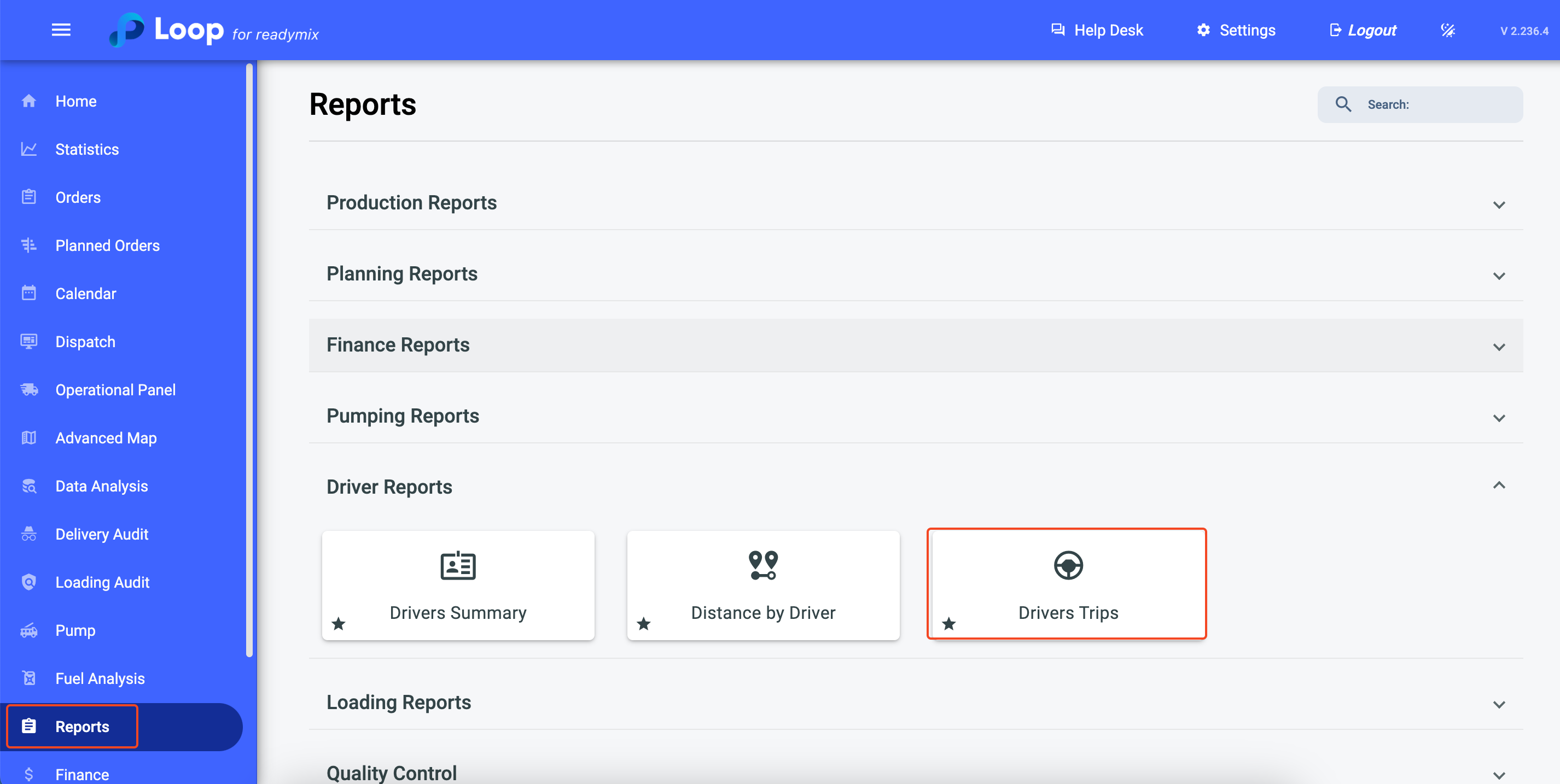 Open the menu on the left side of the screen and select "Reports" - "Driver Reports" - "Driver Trips".