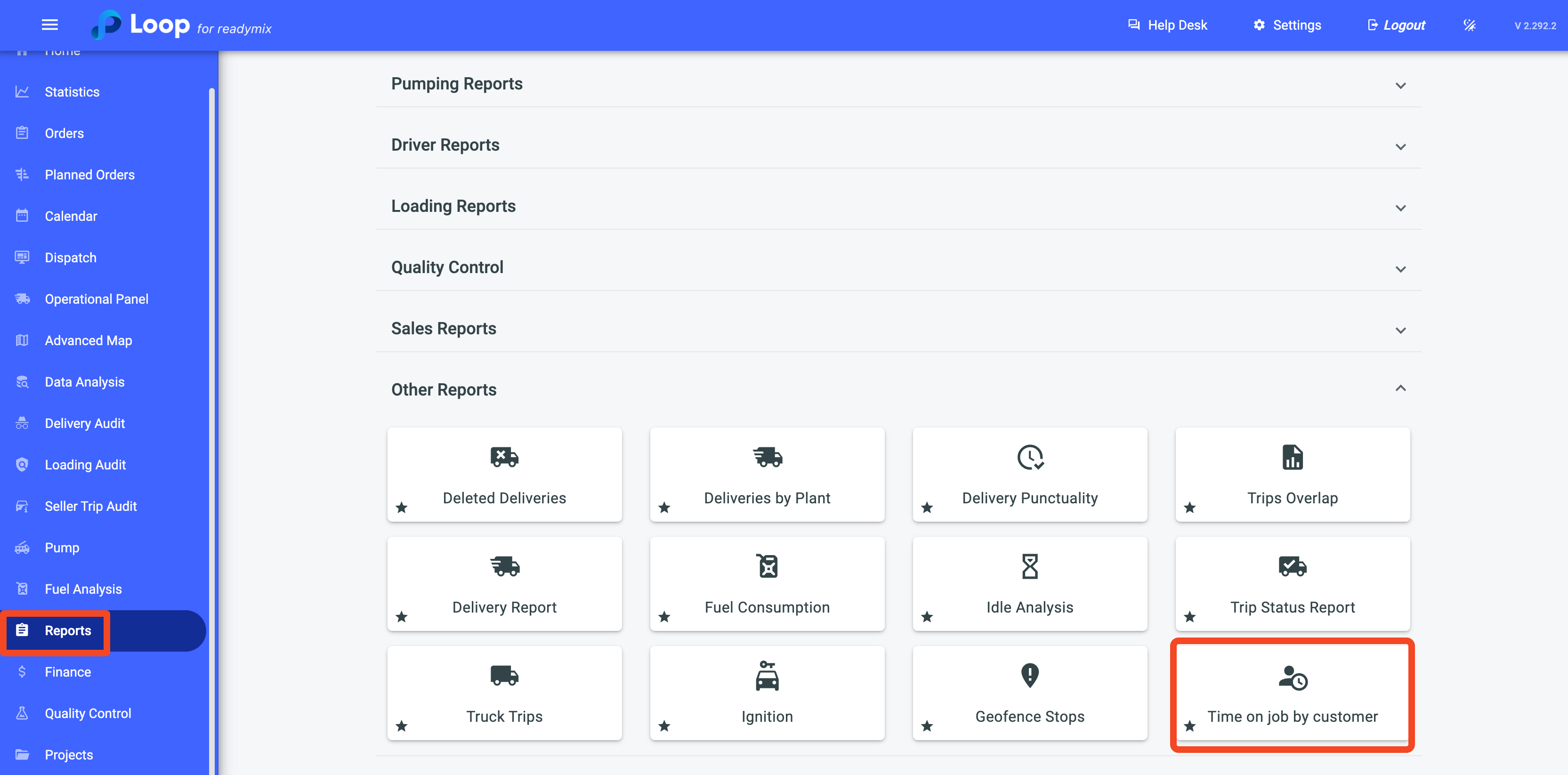 Open the menu on the left side of the screen and select "Reports" - "Other Reports" - "Time on Job by Customer".