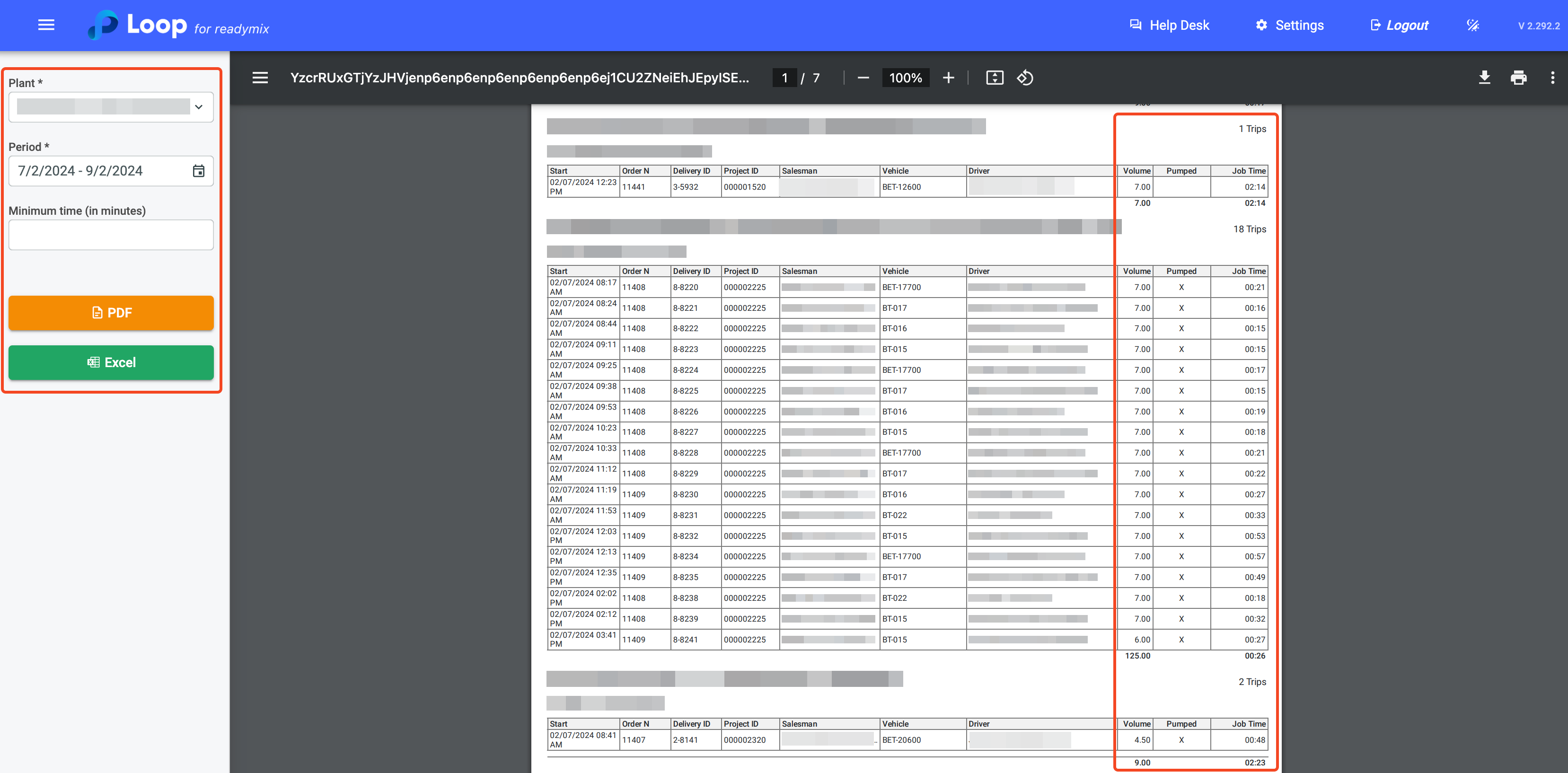 Now simply select the plants, periods, and if you wish to set a minimum time on site, define it in the Minimum Time field (in minutes). Finally, click on "PDF or Excel" to generate your report.