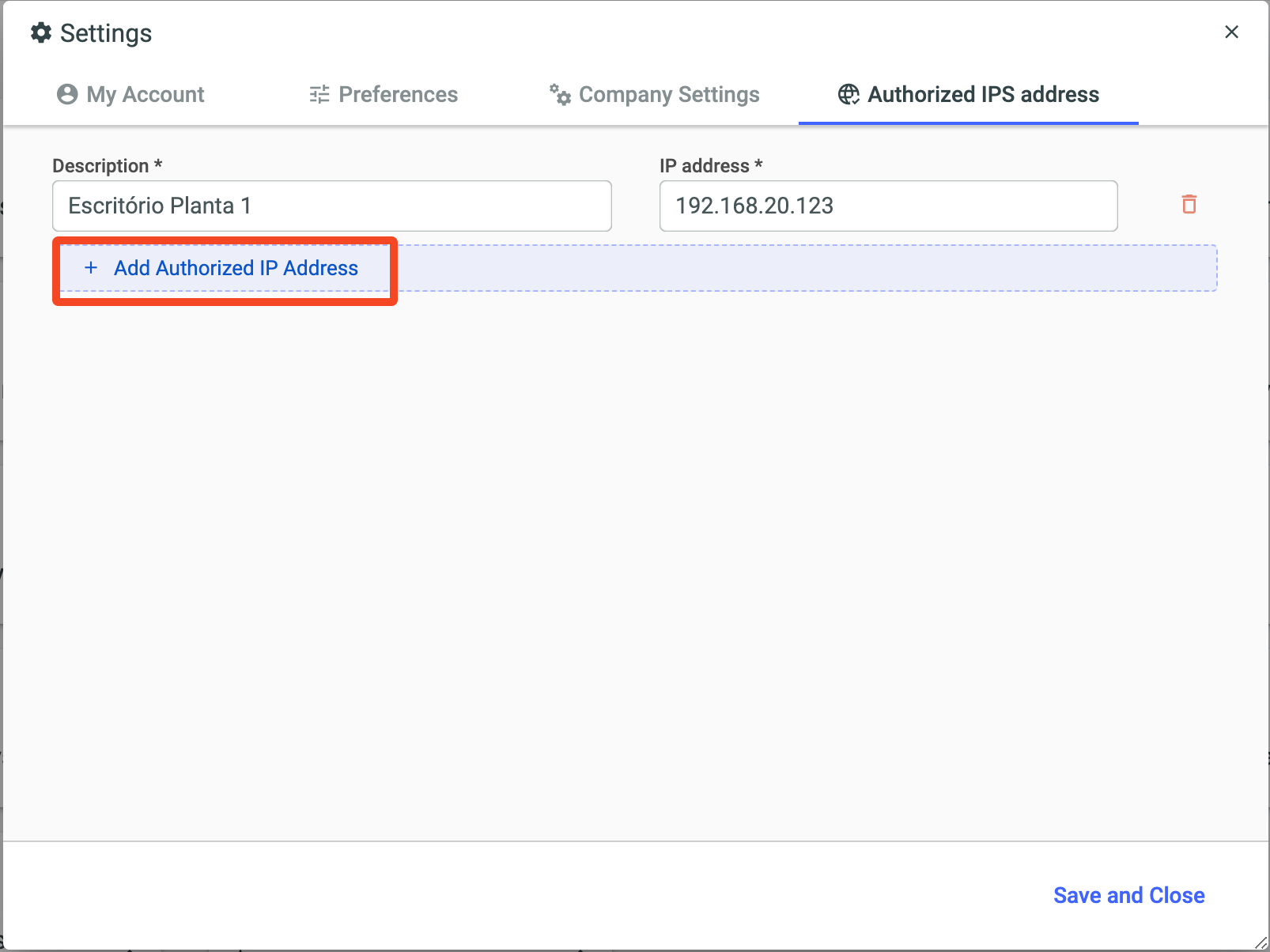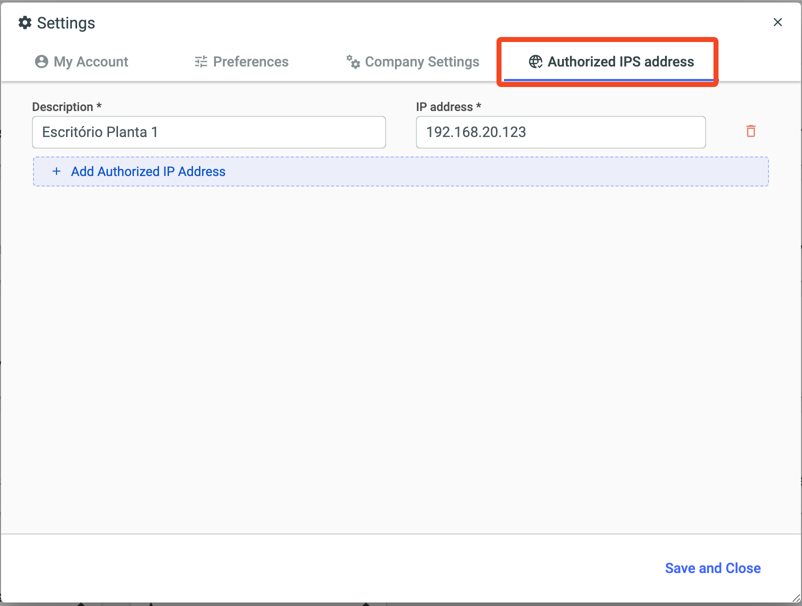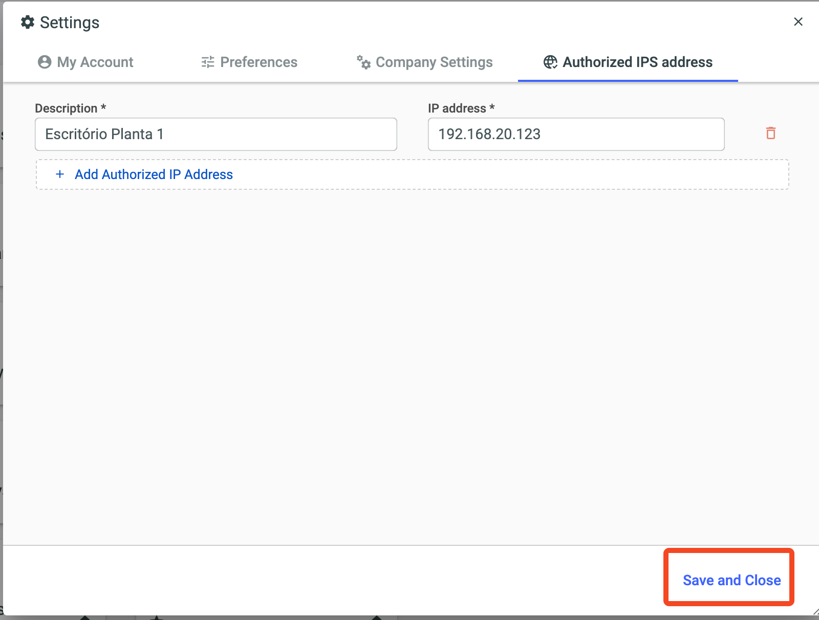 After including the IPs to be authorized, click Save and Close.