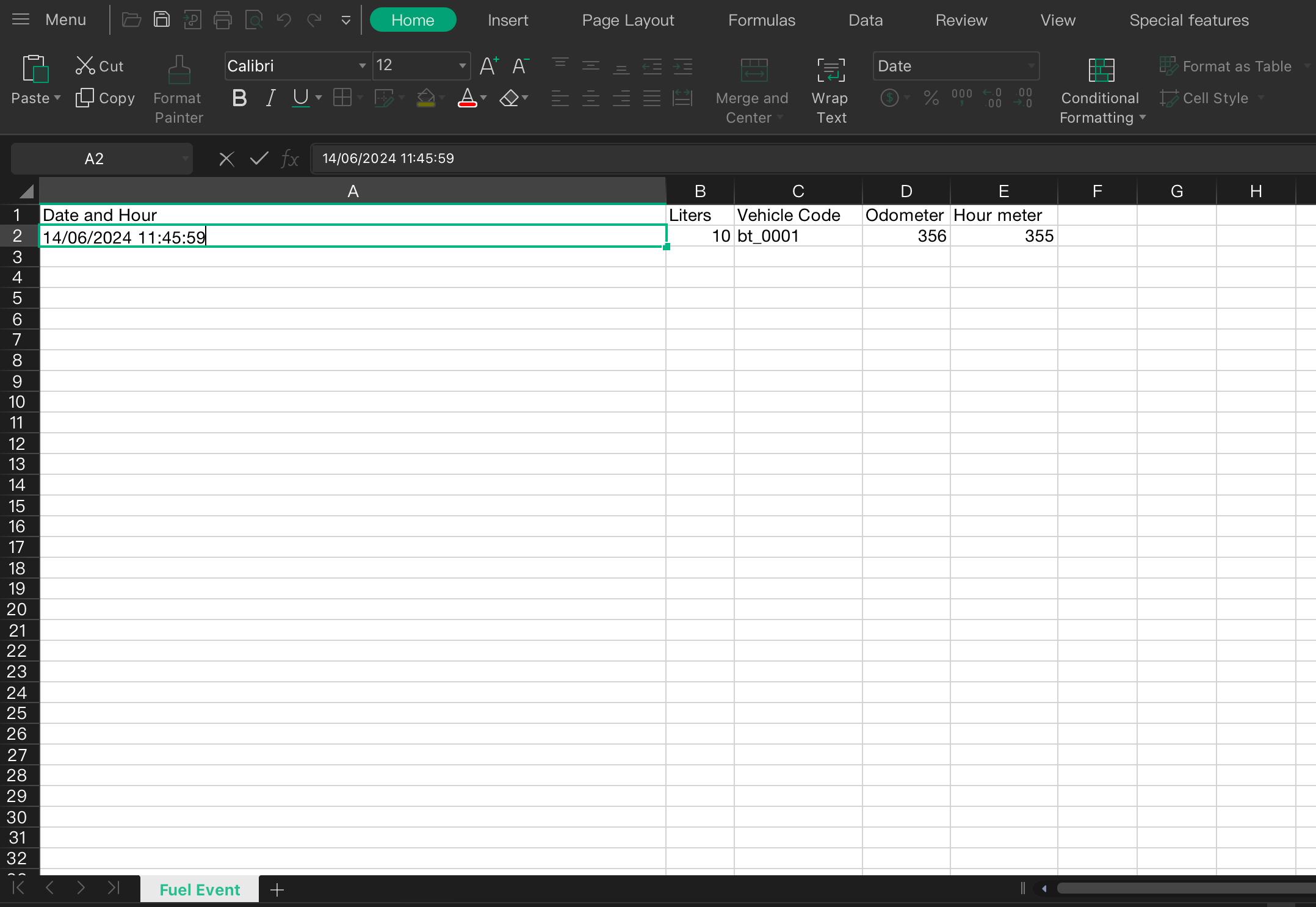 After filling out the spreadsheet with the desired vehicle data and saving it on your computer, return to the Fuel Management screen and click "import" - "Import from an Excel spreadsheet". Then, select the previously filled spreadsheet.