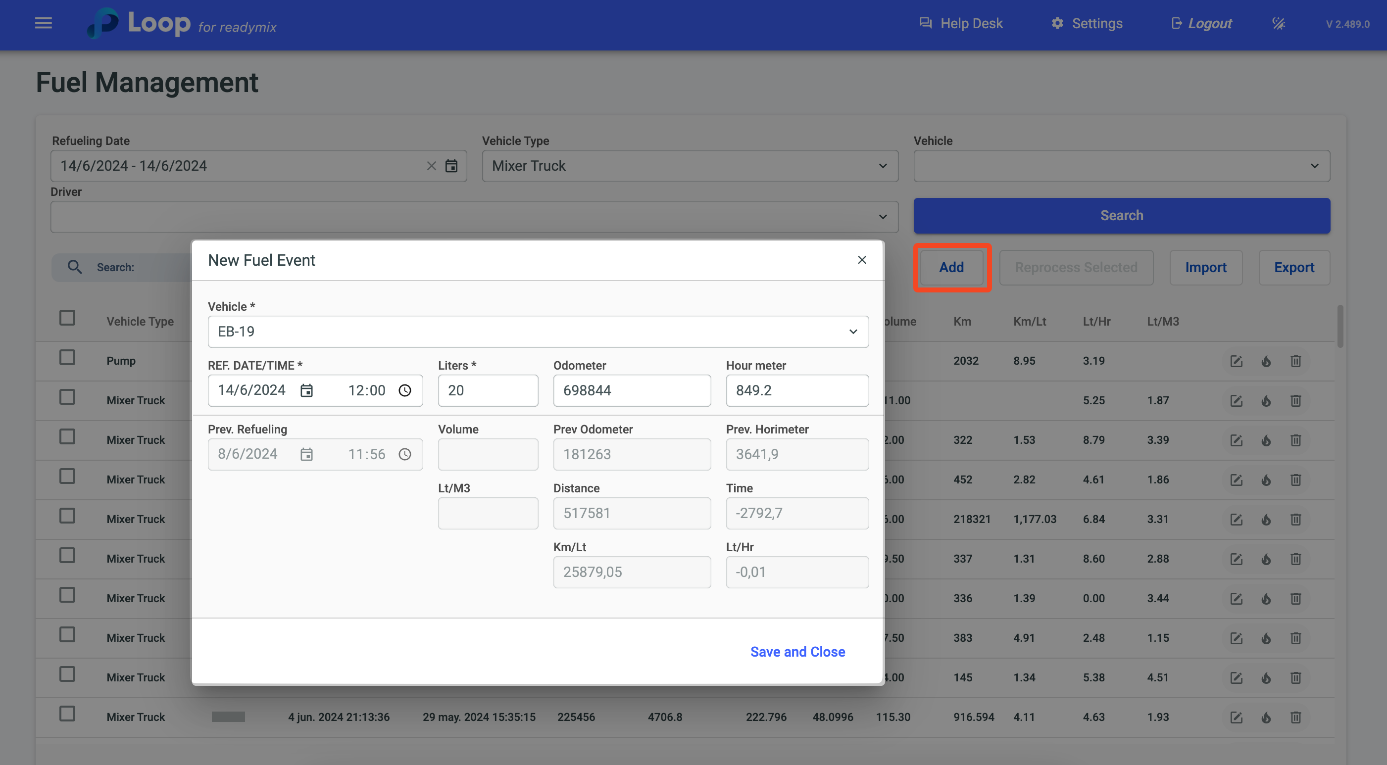 When selecting the vehicle, the system will automatically fill in the Previous Refueling, Previous Odometer, and Previous Hourmeter fields based on the previously recorded event (If there is). Once all necessary fields are filled in, the system will automatically calculate the distance traveled, time, Km/liter, and liters/hour, using the data from the last recorded event for the vehicle.