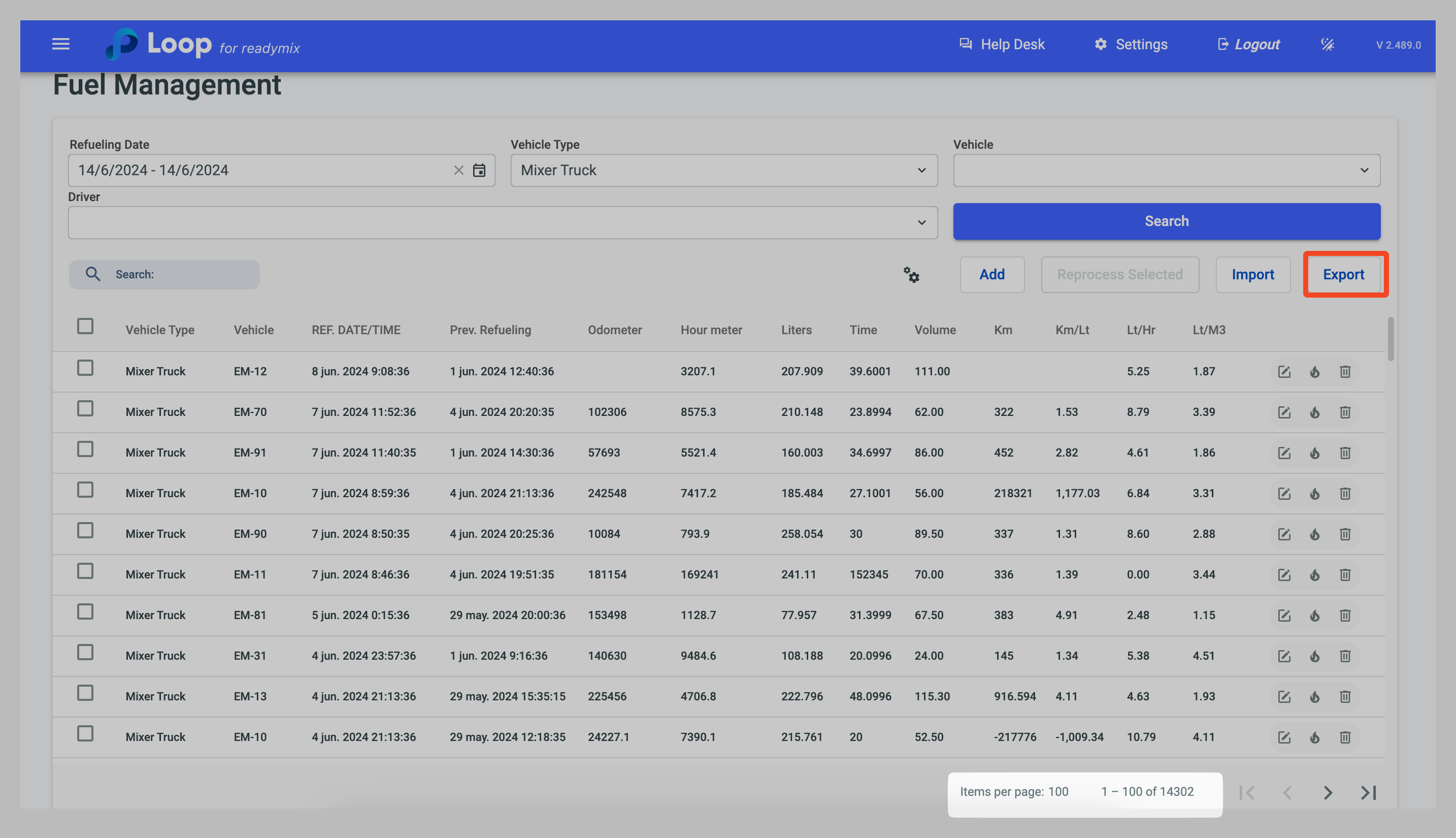 If you have not set a Refueling Date in the filters, the exported Excel spreadsheet will only show the 100 Fuel Events displayed on each page of the Fuel Management module.