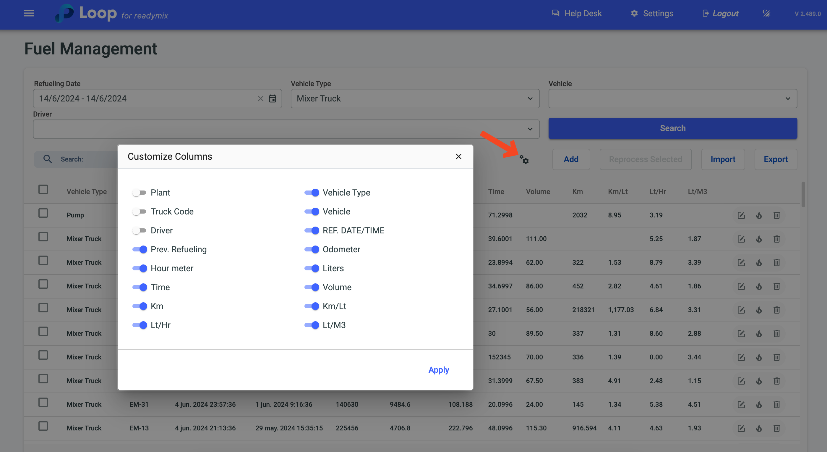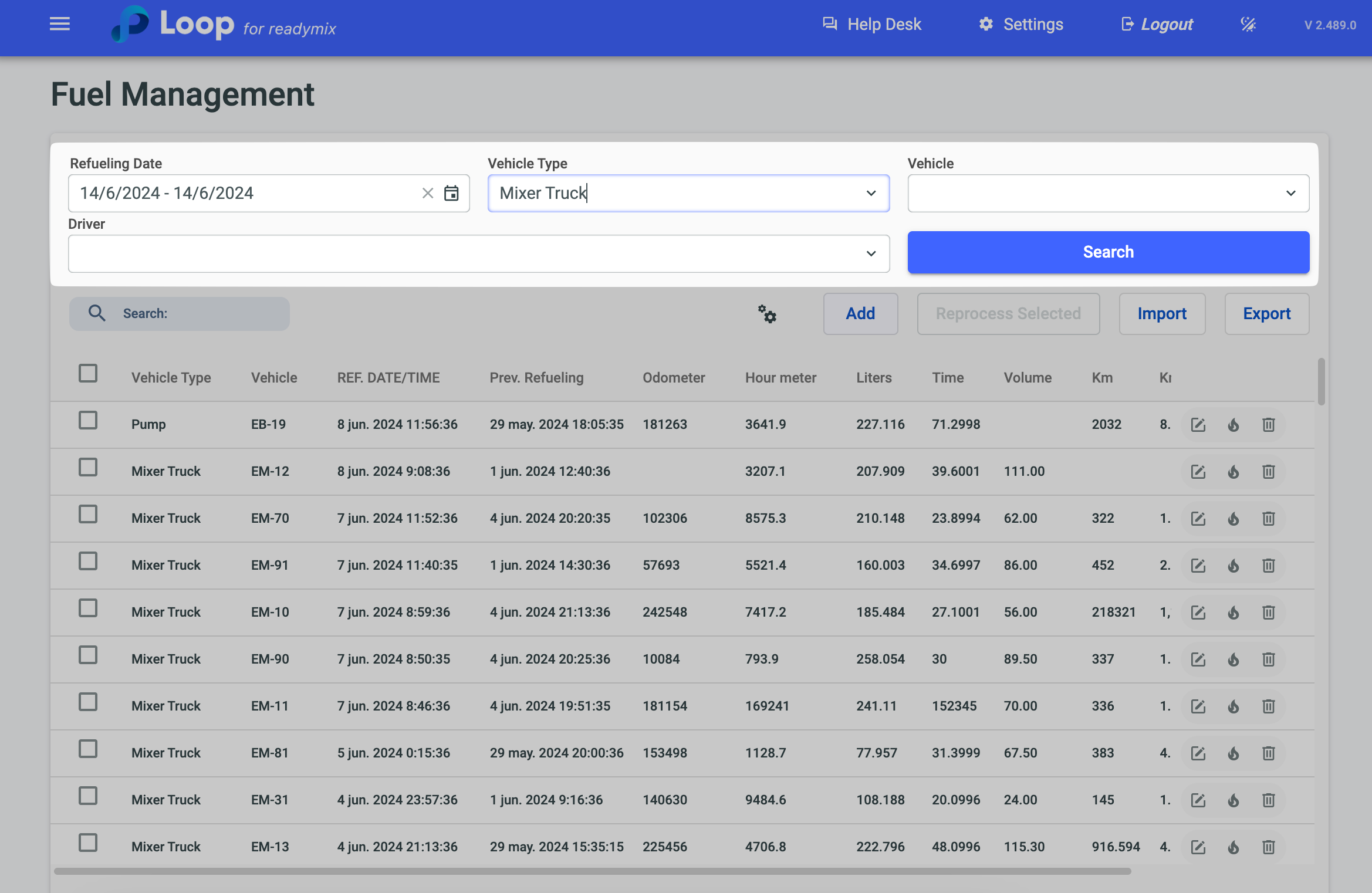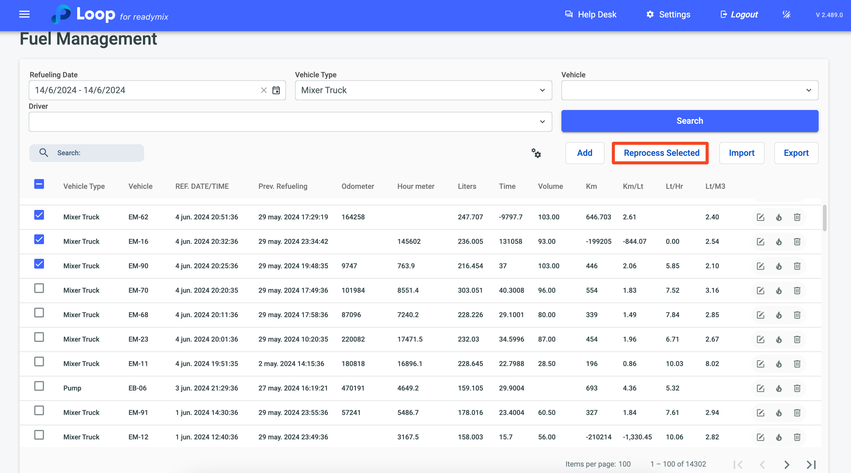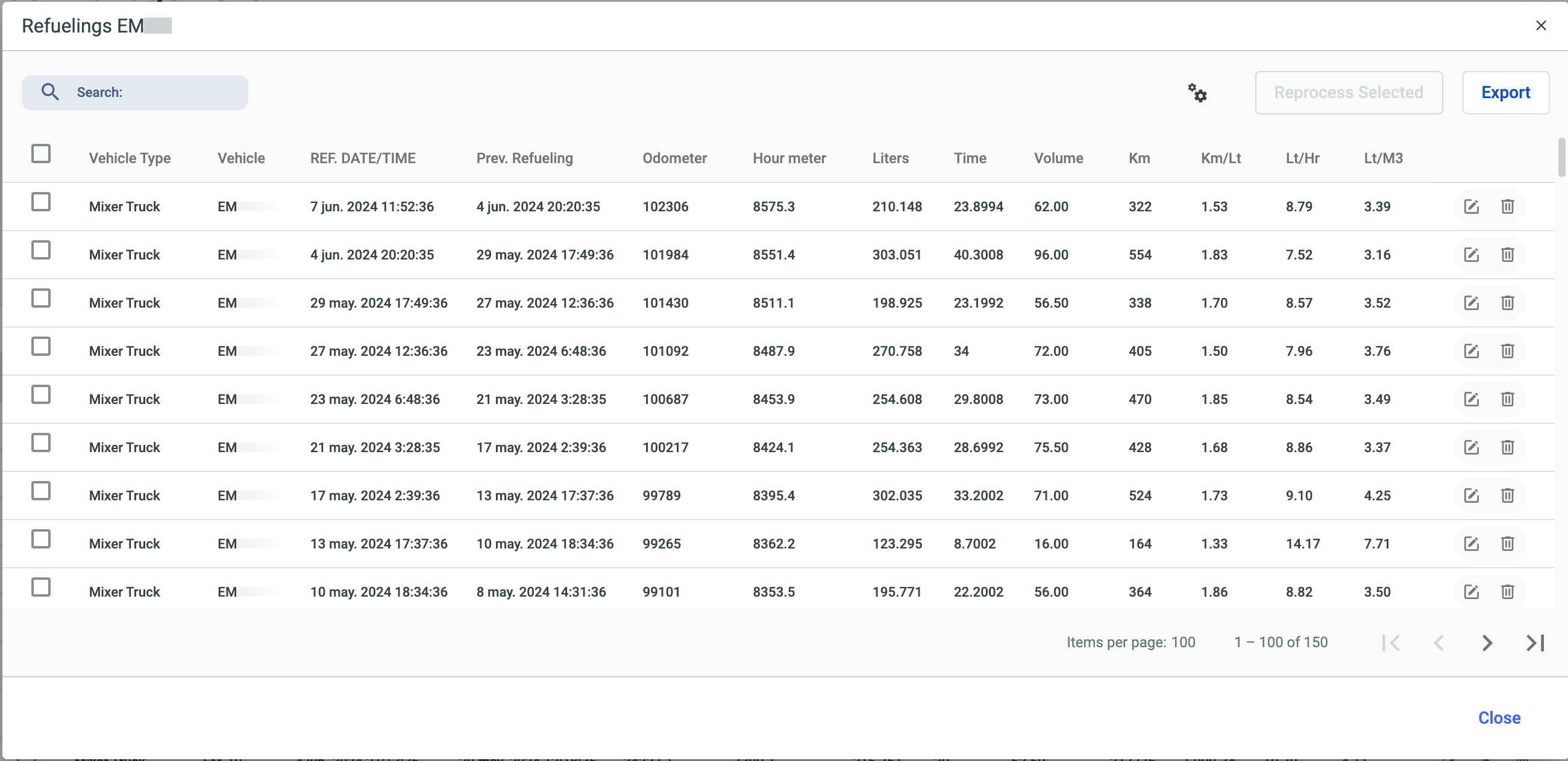 The "Reprocess Selected" button allows you to reprocess the data of the selected refuelings. By clicking this button, the system recalculates and updates the information on distance traveled, time, Km/liter, and liters/hour for the selected vehicles using the most updated data available. This ensures that all information is current and accurate, correcting any inconsistencies or incorrect data that may have been previously recorded.