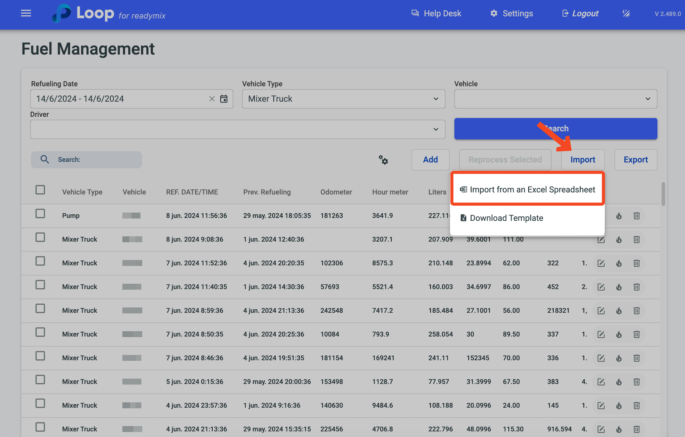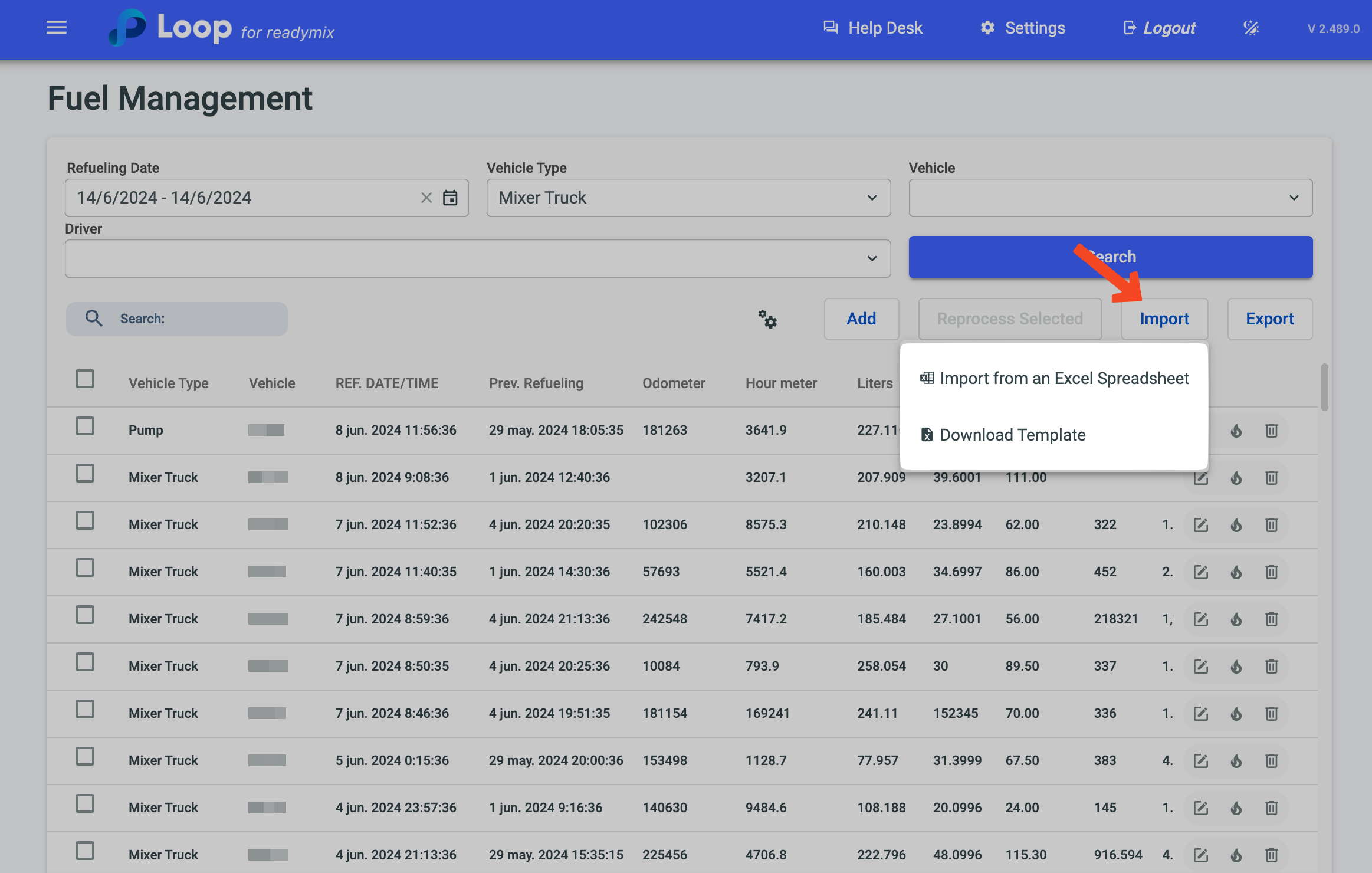 Quickly and easily import an Excel spreadsheet with fuel event data for multiple vehicles at once. To do this, click the Import button.