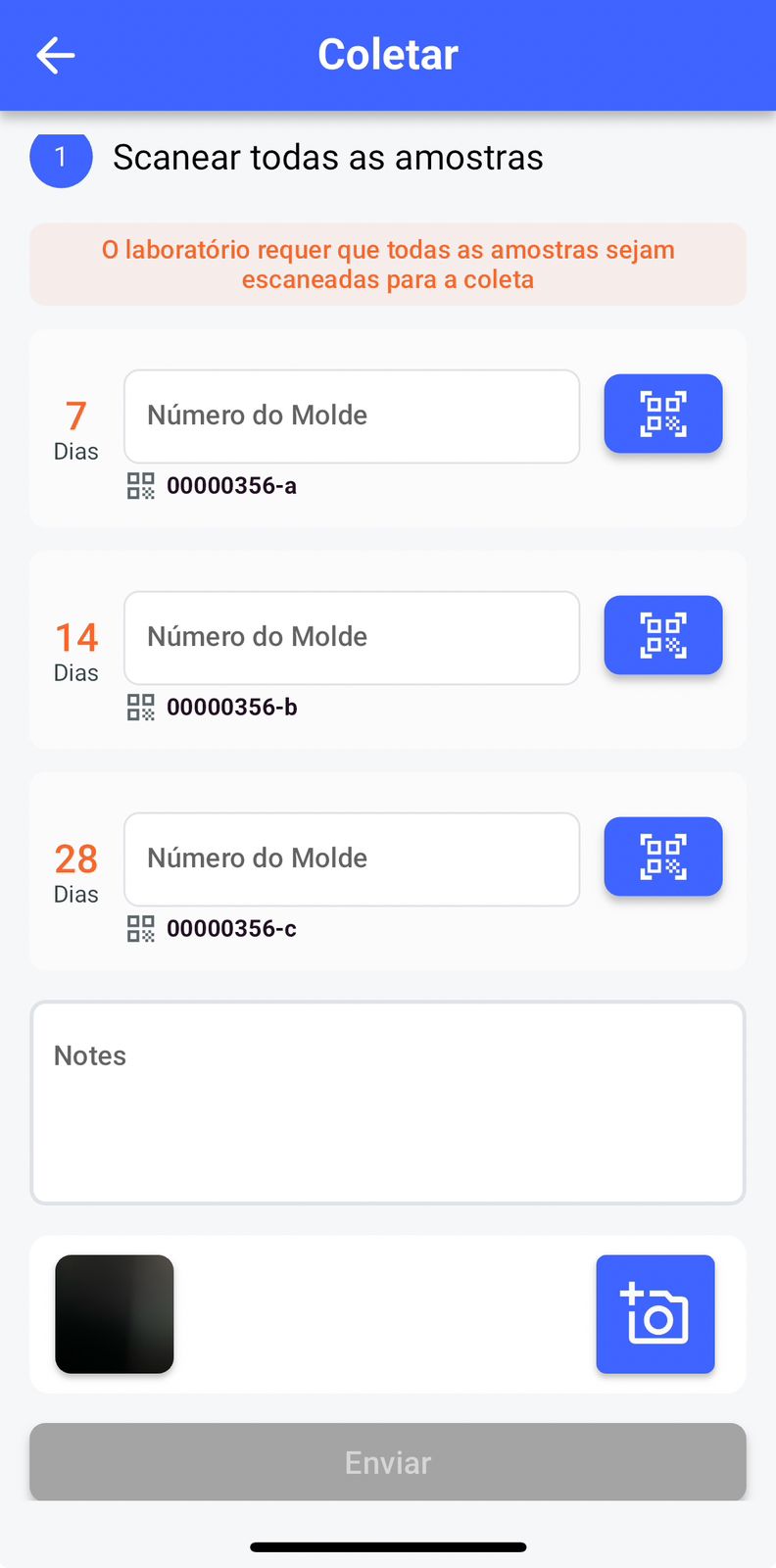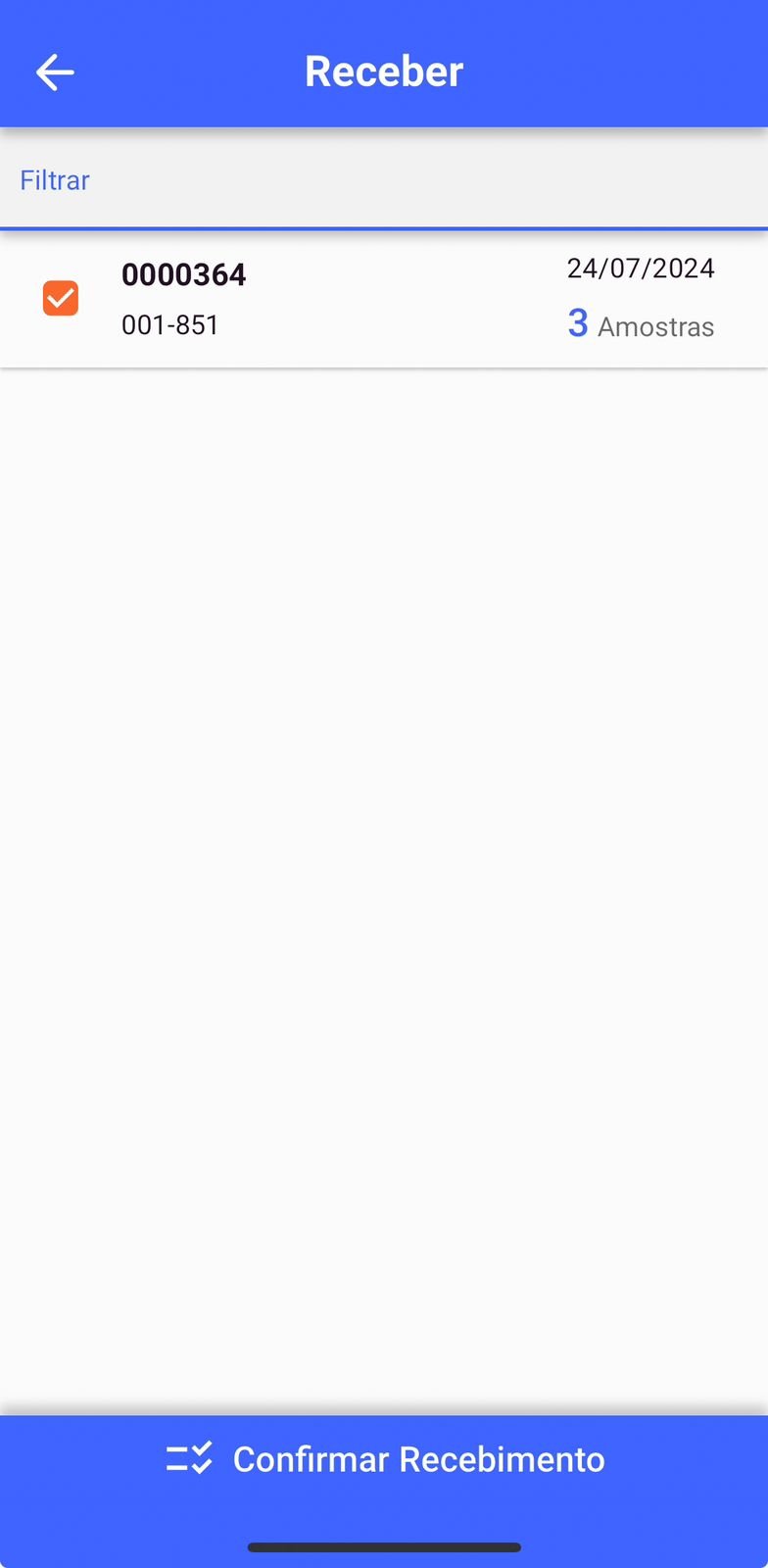 By selecting the laboratory, all samples pending tests will be listed, and you can locate them by QR Code. On this screen, you will see information such as: