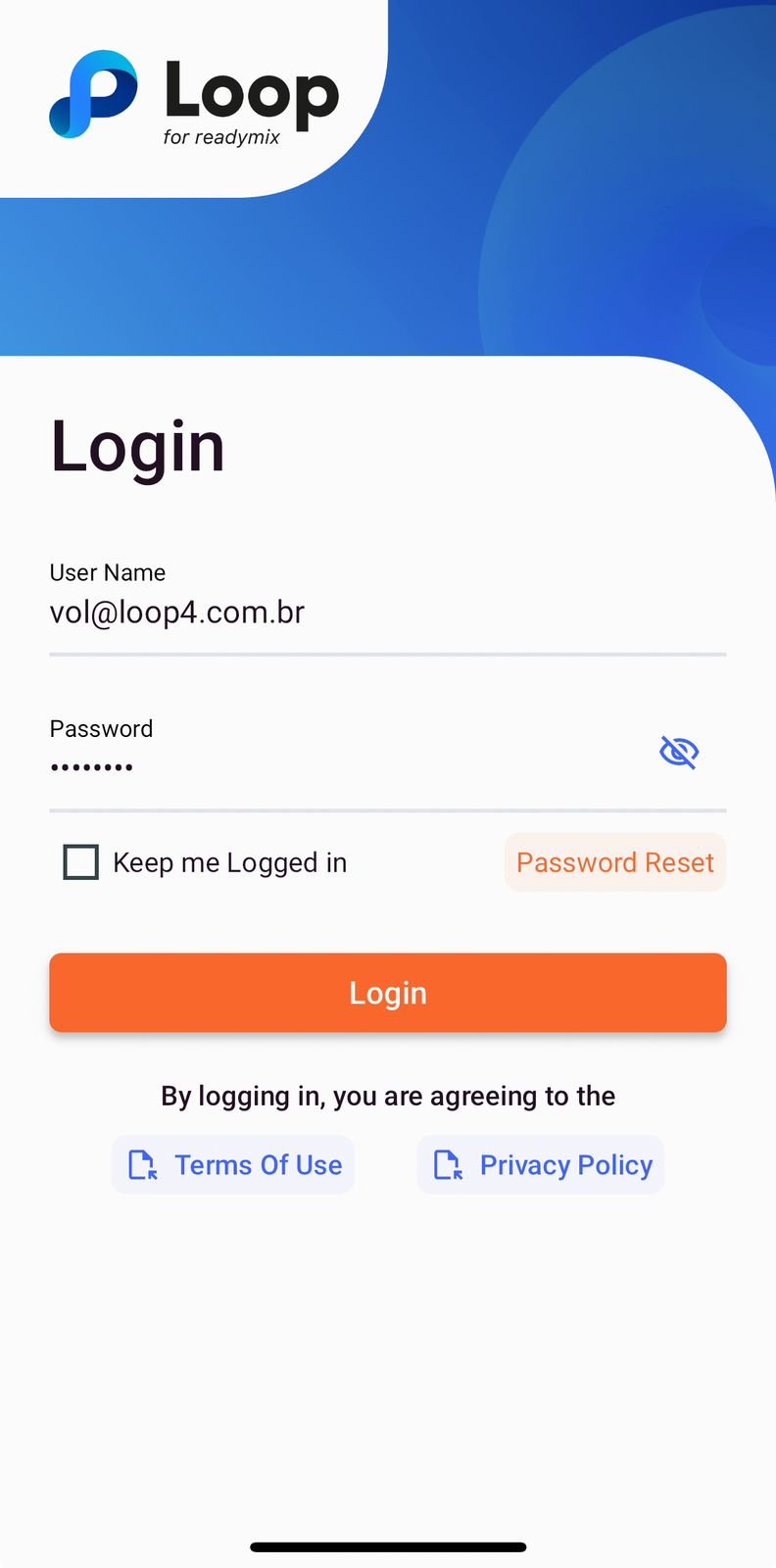 To access the application, log in using the same "User Name" and "Password" as the Loop system. This login ensures that each inspection is linked to the correct user.